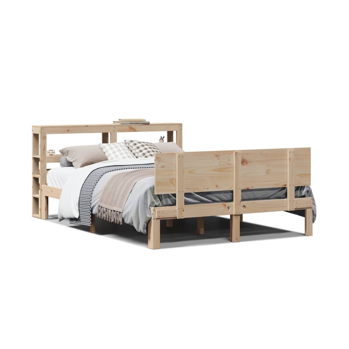 ¡Disfruta de una buena noche de sueño en esta estructura de cama de madera! Es un aporte práctico y decorativo para la casa. Madera de pino maciza: La madera de pino maciza es un bonito material natural. La madera de pino tiene vetas rectas, y los nudos dan al material su distintivo aspecto rústico.Listones de madera contrachapada: Los listones de madera contrachapada ofrecen una buena distribución del peso, lo que garantiza el tan necesario soporte y la transpirabilidad del colchón.Amplio espacio de almacenamiento: Este elegante cabecero de la cama cuenta con dos prácticos estantes, que ofrecen un amplio espacio de almacenamiento para tener todos tus artículos esenciales para la noche al alcance de la mano.Cabecero independiente: El cabecero independiente ofrece una solución sin complicaciones para colocarlo y reposicionarlo sin esfuerzo y sin necesidad de instalarlo en la pared. Información útil: El colchón no está incluido con la cama. Disponemos de una variada selección de colchones. Puedes echar un vistazo a nuestra tienda para buscar el colchón correspondiente.