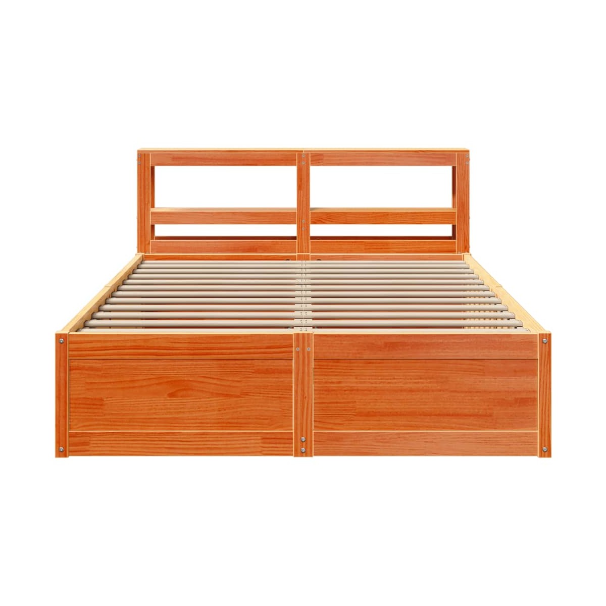 Consigue un sueño más reparador con esta estructura de cama. Es un aporte acogedor para cualquier dormitorio. Estructura estable y duradera: La madera de pino maciza es conocida por su resistencia y durabilidad. Sus vetas rectas y sus característicos nudos contribuyen a su encanto rústico.Somier de láminas para un soporte óptimo: La estructura de cama está equipada con un somier de láminas para el apoyo y la transpirabilidad del colchón.Amplio espacio de almacenamiento: Este elegante cabecero de la cama cuenta con dos prácticos estantes, que ofrecen un amplio espacio de almacenamiento para tener todos tus artículos esenciales para la noche al alcance de la mano.Cabecero independiente: El cabecero independiente ofrece una solución sin complicaciones para colocarlo y reposicionarlo sin esfuerzo y sin necesidad de instalarlo en la pared. Información útil:El colchón no está incluido con la cama. Disponemos de una variada selección de colchones. Puedes echar un vistazo a nuestra tienda para buscar el colchón correspondiente.