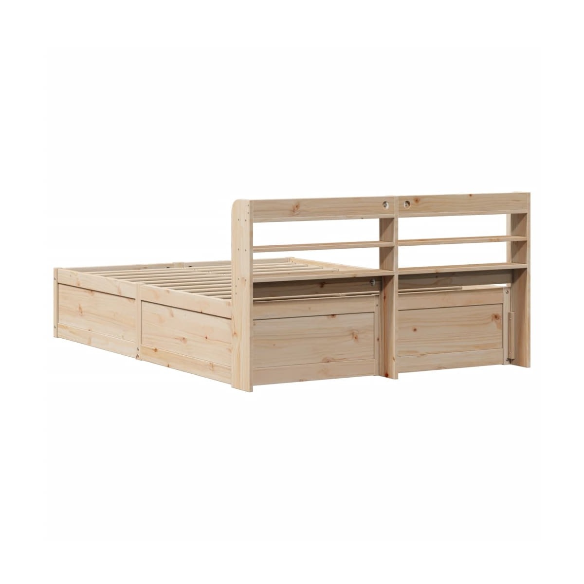 Consigue un sueño más reparador con esta estructura de cama. Es un aporte acogedor para cualquier dormitorio. Estructura estable y duradera: La madera de pino maciza es conocida por su resistencia y durabilidad. Sus vetas rectas y sus característicos nudos contribuyen a su encanto rústico.Somier de láminas para un soporte óptimo: La estructura de cama está equipada con un somier de láminas para el apoyo y la transpirabilidad del colchón.Amplio espacio de almacenamiento: Este elegante cabecero de la cama cuenta con tres prácticos estantes, que ofrecen un amplio espacio de almacenamiento para mantener todos tus elementos esenciales de la noche al alcance de la mano.Cabecero independiente: El cabecero independiente ofrece una solución sin complicaciones para colocarlo y reposicionarlo sin esfuerzo y sin necesidad de instalarlo en la pared. Información útil:El colchón no está incluido con la cama. Disponemos de una variada selección de colchones. Puedes echar un vistazo a nuestra tienda para buscar el colchón correspondiente.
