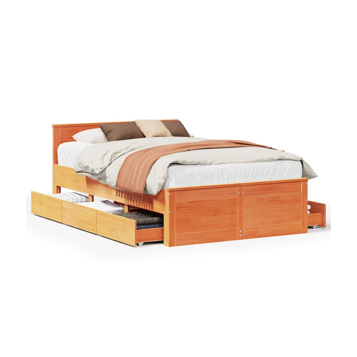 Consigue un sueño más reparador con esta estructura de cama. Es un aporte acogedor para cualquier dormitorio. Estructura estable y duradera: La madera de pino maciza es conocida por su resistencia y durabilidad. Sus vetas rectas y sus característicos nudos contribuyen a su encanto rústico.Somier de láminas para un soporte óptimo: La estructura de cama está equipada con un somier de láminas para el apoyo y la transpirabilidad del colchón.Patas estables y duraderas: Esta cama está sostenida por patas resistentes, lo que garantiza estabilidad, seguridad y firmeza.Cabecero funcional: El cabecero de la cama de madera puede mantener el colchón en su sitio. Además, el cabecero te brinda un excelente soporte para la espalda mientras estás sentado leyendo o mirando la televisión.Función de almacenamiento: Este somier ofrece cajones para mantener tus revistas, libros, juguetes y otros objetos pequeños bien organizados. Información útil:El colchón no está incluido con la cama. Disponemos de una variada selección de colchones. Puedes echar un vistazo a nuestra tienda para buscar el colchón correspondiente.