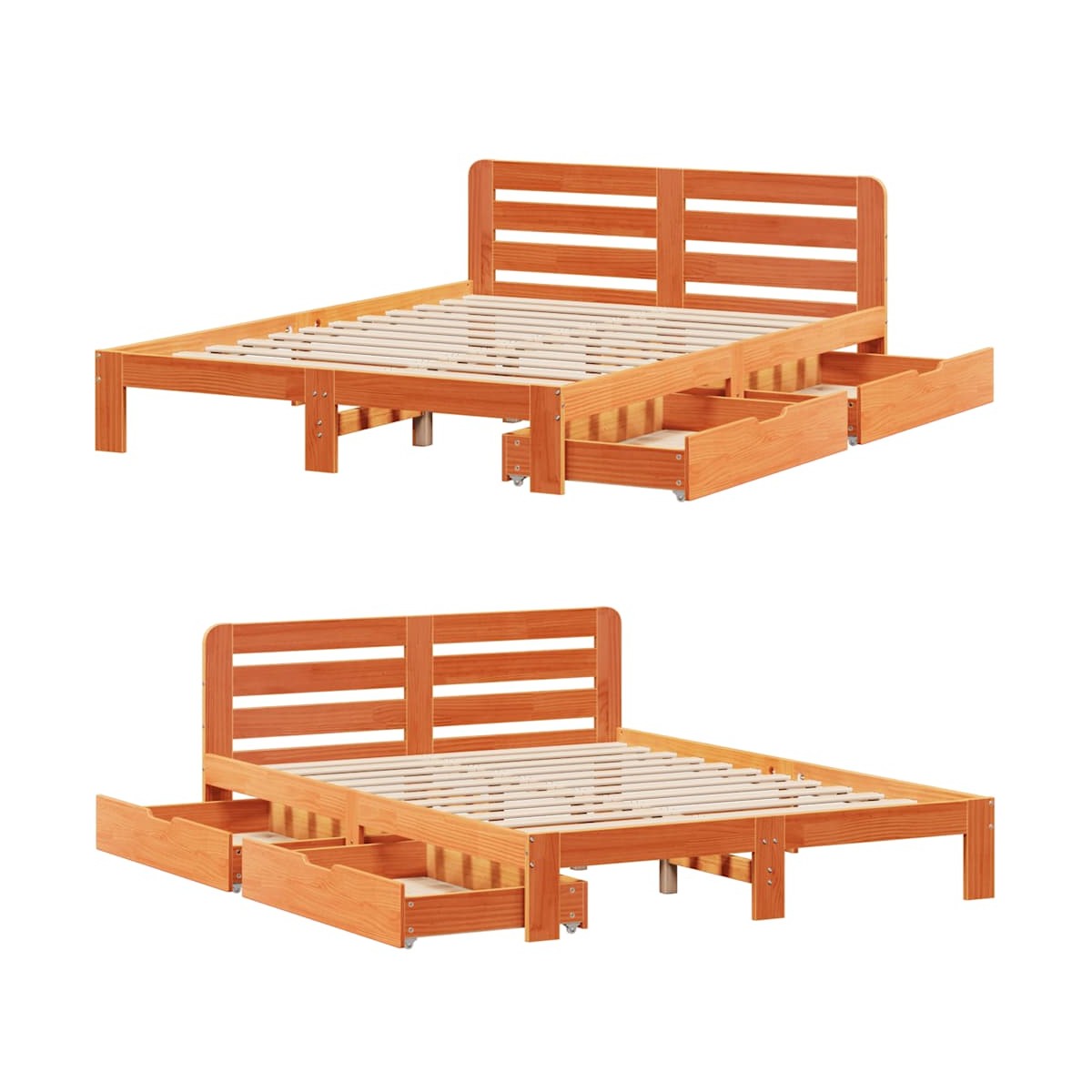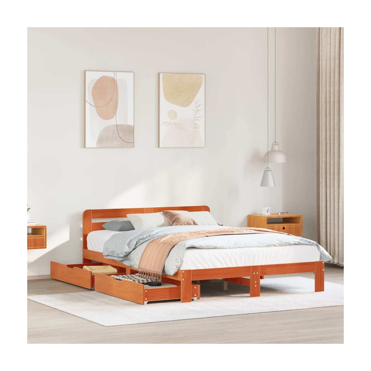 Consigue un sueño más reparador con esta estructura de cama. Es un aporte acogedor para cualquier dormitorio. Estructura estable y duradera: La madera de pino maciza es conocida por su resistencia y durabilidad. Sus vetas rectas y sus característicos nudos contribuyen a su encanto rústico.Somier de láminas para un soporte óptimo: El base de cama está equipado con un somier de láminas para el apoyo y la transpirabilidad del colchón.Maniobrabilidad sin esfuerzo: Este cajón de almacenamiento bajo la cama cuenta con cuatro ruedas, que proporcionan una maniobrabilidad suave y sin esfuerzo para deslizarse dentro y fuera de debajo de tu cama.Patas estables y duraderas: Este somier está sostenido por patas resistentes, lo que garantiza estabilidad, seguridad y firmeza.Cabecero versátil: Esta cama de paneles viene con un cabecero que proporciona un excelente soporte para la espalda cuando te sientas en la cama para leer o ver la televisión, a la vez que sirve como elemento decorativo. Información útil:El colchón no está incluido con la cama. Disponemos de una variada selección de colchones. Puedes echar un vistazo a nuestra tienda para buscar el colchón correspondiente.