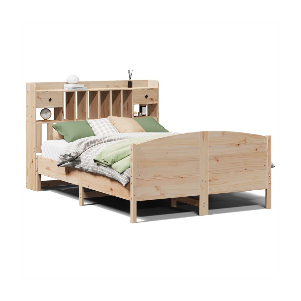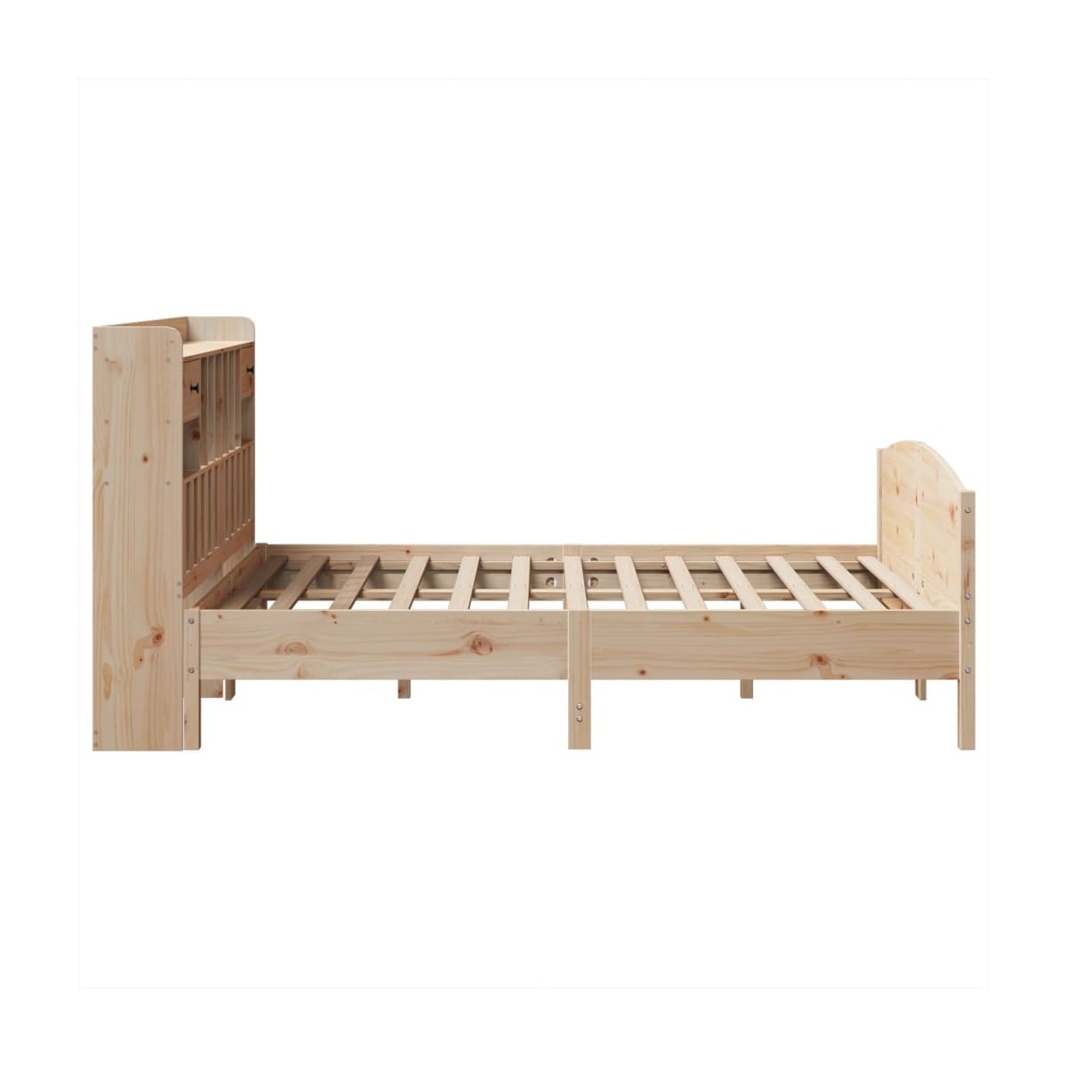 ¡Consigue una mejor noche de sueño reparador con esta cama con estantería! Es un aporte acogedor para cualquier dormitorio. Estructura estable y duradera: La madera de pino maciza es conocida por su resistencia y durabilidad. Sus vetas rectas y sus característicos nudos contribuyen a su encanto rústico. Somier de láminas para un soporte óptimo: La estructura de cama está equipada con un somier de láminas para el apoyo y la transpirabilidad del colchón. Amplio espacio de almacenamiento: El cabecero de estantería ofrece un amplio espacio de almacenamiento para mantener libros, artículos decorativos o pertenencias personales al alcance de la mano, lo que reduce el desorden en el dormitorio. Práctico pie de cama: El pie de cama no solo contribuye a la estabilidad general del marco de la cama, proporcionando un entorno seguro para dormir, sino que también asegura su colchón en su lugar y evita que las mantas, sábanas y otra ropa de cama se caigan del extremo de la cama, manteniendo una apariencia ordenada. Ahorro de espacio: Este cabecero es una opción de ahorro de espacio que puede sustituir la necesidad de una mesilla de noche, ayudando a maximizar el espacio de tu dormitorio, y haciéndolo ideal para espacios pequeños o limitados. Información útil:El colchón no está incluido con la cama. Disponemos de una variada selección de colchones. Puedes echar un vistazo a nuestra tienda para buscar el colchón correspondiente.