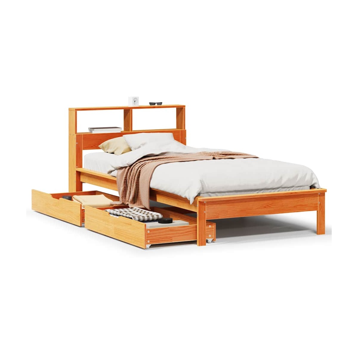 ¡Consigue una mejor noche de sueño reparador con esta cama con estantería! Es un aporte acogedor para cualquier dormitorio. Estructura estable y duradera: La madera de pino maciza es conocida por su resistencia y durabilidad. Sus vetas rectas y sus característicos nudos contribuyen a su encanto rústico.Somier de láminas para un soporte óptimo: El base de cama está equipado con un somier de láminas para el apoyo y la transpirabilidad del colchón.Maniobrabilidad sin esfuerzo: Este cajón de almacenamiento bajo la cama cuenta con cuatro ruedas, que proporcionan una maniobrabilidad suave y sin esfuerzo para deslizarse dentro y fuera de debajo de tu cama.Patas estables y duraderas: Este somier está sostenido por patas resistentes, lo que garantiza estabilidad, seguridad y firmeza.Ahorro de espacio: Este cabecero es una opción de ahorro de espacio que puede sustituir la necesidad de una mesilla de noche, ayudando a maximizar el espacio de tu dormitorio, y haciéndolo ideal para espacios pequeños o limitados. Información útil:El colchón no está incluido con la cama. Disponemos de una variada selección de colchones. Puedes echar un vistazo a nuestra tienda para buscar el colchón correspondiente.