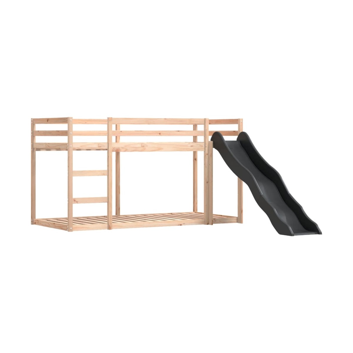 Esta litera de madera es elegante y funcional, por lo que es un aporte perfecto para cualquier habitación con espacio limitado. Madera maciza de pino: Esta litera está hecha de madera de pino maciza para mayor estabilidad y durabilidad. La madera de pino tiene un grano recto, y los nudos dan al material su firma, aspecto rústico.Mucha diversión: Puedes combinar las cortinas con la litera baja para crear la base secreta para tu hijo. ¡La hora de dormir será un juego y la cama será el centro de atención del dormitorio!Barandillas de seguridad: La litera superior cuenta con barandillas de seguridad en los 4 lados, para que tu hijo pueda dormir sin preocuparse por si se cae.Cómoda escalera y tobogán: Esta litera doble tiene un divertido tobogán que aporta alegría y convierte la habitación en un patio de recreo interior. La combinación de una escalera y un tobogán hace que la hora de acostarse sea más animada e interesante para los niños.Listones robustos: Los listones de madera contrachapada proporcionan una buena distribución del peso, lo que garantiza que el colchón se mantenga en tu sitio con cada giro y vuelta del cuerpo mientras duermes. Información útil:El colchón no está incluido con la cama. Disponemos de una variada selección de colchones. Puedes echar un vistazo a nuestra tienda para buscar el colchón correspondiente. Advertencia:Para evitar que vuelque, este producto debe usarse con el dispositivo de fijación a la pared suministrado.