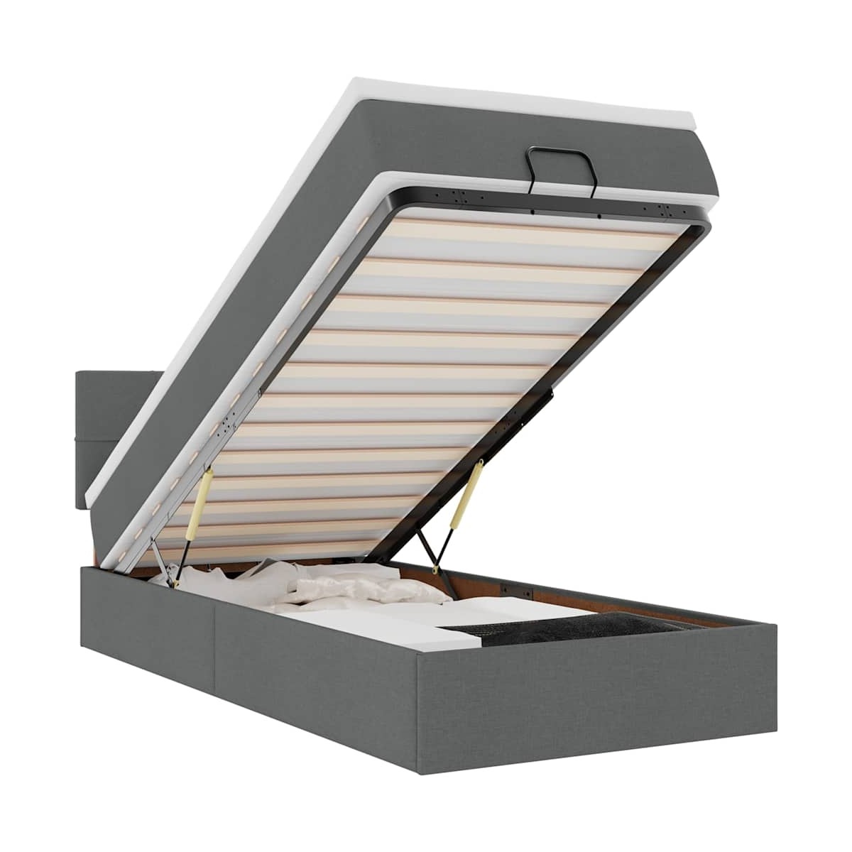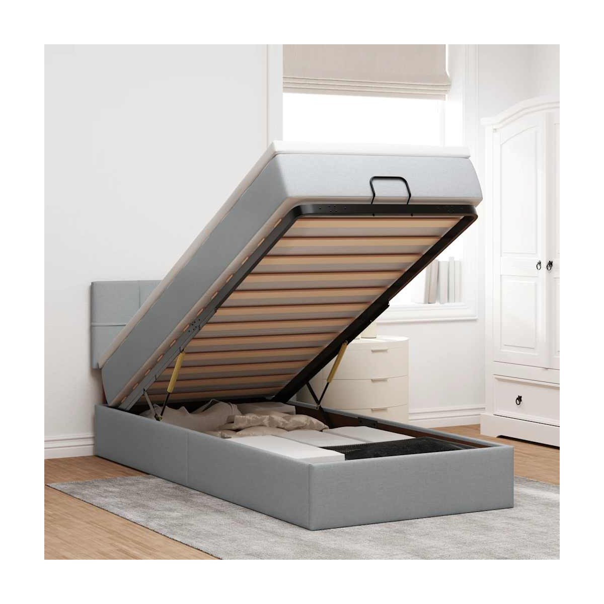 ¡Utilice esta cama otomana con colchón para disfrutar de una noche de sueño reparador! Le ofrece una solución de almacenamiento y una experiencia de sueño cómoda. Material suave y duradero: La tela de poliéster ofrece una combinación de suavidad, transpirabilidad y durabilidad, lo que garantiza que experimentes la máxima comodidad.Colchón de muelles ensacados: Este colchón de muelles ensacados cuenta con muelles ensacados individuales que funcionan de forma independiente para proporcionar un apoyo personalizado reaccionando únicamente a la presión de cada zona. Este diseño evita que se enrolle y reduce la transferencia de movimiento en comparación con los colchones tradicionales de bobina abierta. Cada muelle ensacado sostiene el cuerpo individualmente.amplio espacio de almacenamiento debajo de la cama: gracias al mecanismo de elevación hidráulico, el marco de la cama ofrece un amplio espacio de almacenamiento debajo de la cama, maximizando el espacio sin ocupar área adicional en el piso.Cubrecolchón cómodo: Este cubrecolchón mejora el soporte y la comodidad con su superficie suave y transpirable al tiempo que prolonga la vida útil de su colchón. Su funda extraíble permite un fácil lavado, lo que facilita el mantenimiento.Luces LED para un ambiente agradable: Esta cama cuenta con luces LED que se pueden ajustar fácilmente para crear un espectáculo de luces personalizado. Puedes personalizar los modos, los colores y el brillo para mejorar el ambiente de tu espacio interior. Información útil:El producto tiene un conector USB que necesita una fuente de alimentación USB certificada de 5 V (no incluida).Por razones de higiene, el colchón no puede devolverse si se ha quitado o abierto el embalaje.Únicamente puedes cortar por la parte con el símbolo de las tijeras y únicamente la parte con el USB seguirá funcionando como antes.