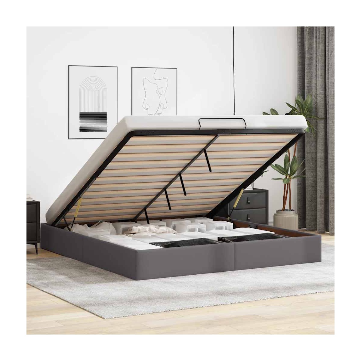 Este marco de cama otomana combina a la perfección la estética moderna con la funcionalidad práctica, ofreciéndole tanto una solución de almacenamiento como una experiencia de sueño cómoda. Larga duración y fácil mantenimiento: El cuero sintético es un material muy duradero y resistente a las manchas, por lo que es fácil de limpiar con un paño húmedo. Su superficie lisa le da un aspecto elegante que recuerda al cuero auténtico.Amplio espacio de almacenamiento debajo de la cama: este marco de cama cuenta con un amplio espacio de almacenamiento debajo, lo que maximiza el espacio sin requerir espacio adicional en el piso. Proporciona un amplio espacio para guardar artículos como edredones adicionales, almohadas y ropa de temporada, lo que lo hace ideal para espacios más pequeños o más reducidos.Cómodo mecanismo de elevación: el mecanismo de elevación hidráulico integrado proporciona un fácil acceso a sus pertenencias guardadas debajo de la cama. Con solo tirar de la manija, la base de láminas se levanta suavemente, lo que le permite recuperar sus artículos de manera rápida y sin esfuerzo.No requiere somier: el marco de la cama incluye una base de láminas que proporciona un excelente soporte y transpirabilidad para su colchón, eliminando la necesidad de un somier. Información útil:El colchón no está incluido con la cama. Ofrecemos una variada selección de colchones. Puedes echar un vistazo a nuestra tienda para buscar el colchón correspondiente.