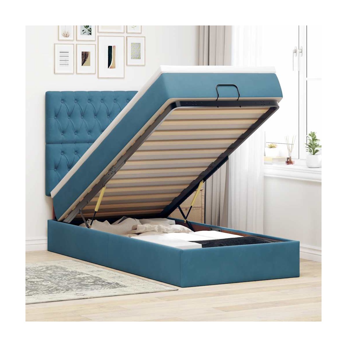 ¡Utilice esta estructura de cama otomana con colchones para disfrutar de una noche de sueño reparador! Le ofrece una solución de almacenamiento y una experiencia de sueño cómoda.Material suave y cómodo: La tela de terciopelo ofrece una superficie suave y lisa que proporciona una agradable sensación contra el tacto, aportándole calidez y el máximo confort.Colchón de muelles ensacados: Este colchón de muelles ensacados cuenta con muelles ensacados individuales que funcionan de forma independiente para proporcionar un apoyo personalizado reaccionando únicamente a la presión de cada zona. Este diseño evita que se enrolle y reduce la transferencia de movimiento en comparación con los colchones tradicionales de bobina abierta. Cada muelle ensacado sostiene el cuerpo individualmente.amplio espacio de almacenamiento debajo de la cama: gracias al mecanismo de elevación hidráulico, el marco de la cama ofrece un amplio espacio de almacenamiento debajo de la cama, maximizando el espacio sin ocupar área adicional en el piso.Cubrecolchón cómodo: Este cubrecolchón mejora el soporte y la comodidad con su superficie suave y transpirable al tiempo que prolonga la vida útil de su colchón. Su funda extraíble permite un fácil lavado, lo que facilita el mantenimiento. Información útil:Por razones de higiene, el colchón no puede devolverse si se ha quitado o abierto el embalaje.