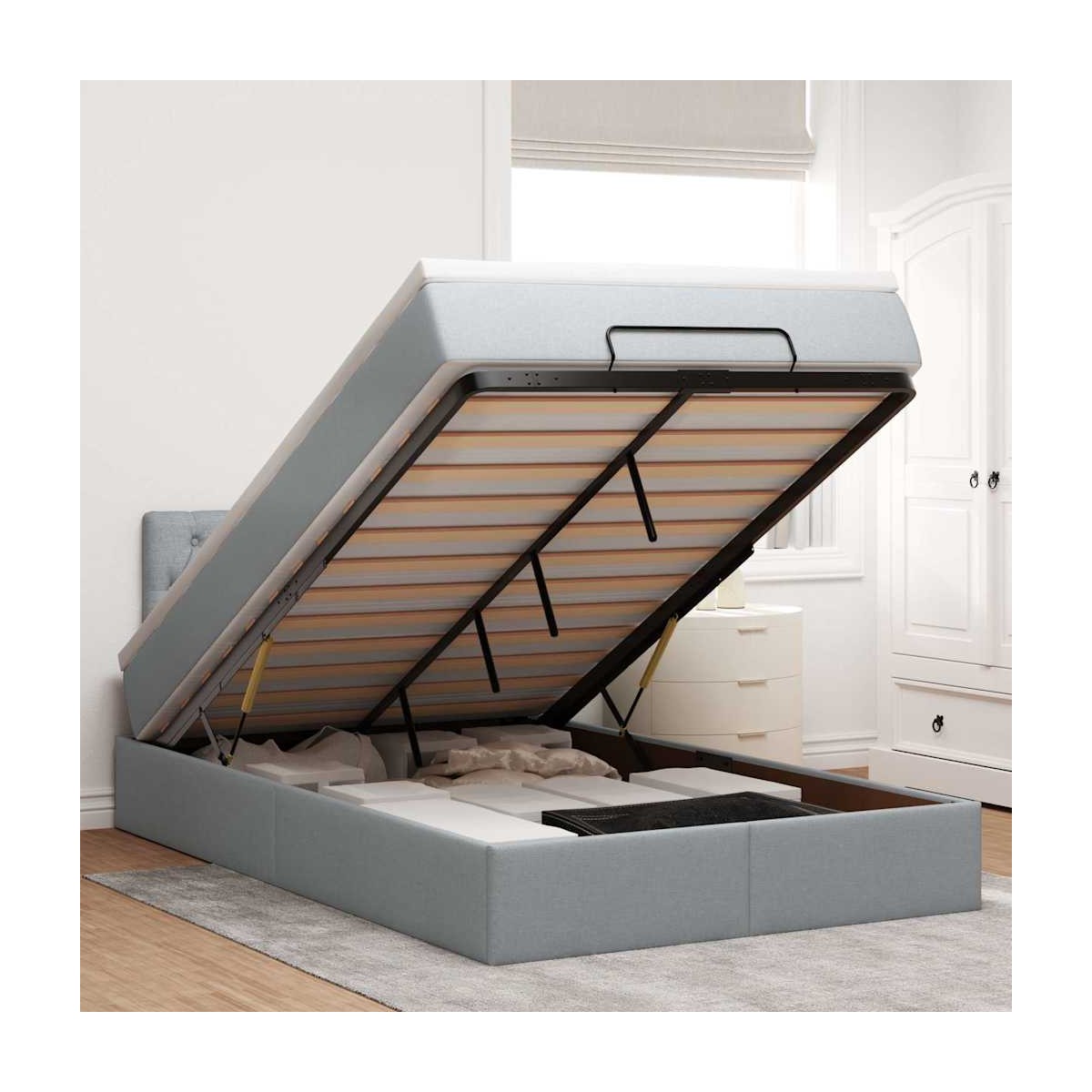 ¡Utilice esta cama otomana con colchón para disfrutar de una noche de sueño reparador! Le ofrece una solución de almacenamiento y una experiencia de sueño cómoda. Material suave y duradero: La tela de poliéster ofrece una combinación de suavidad, transpirabilidad y durabilidad, lo que garantiza que experimentes la máxima comodidad.Colchón de muelles ensacados: Este colchón de muelles ensacados cuenta con muelles ensacados individuales que funcionan de forma independiente para proporcionar un apoyo personalizado reaccionando únicamente a la presión de cada zona. Este diseño evita que se enrolle y reduce la transferencia de movimiento en comparación con los colchones tradicionales de bobina abierta. Cada muelle ensacado sostiene el cuerpo individualmente.amplio espacio de almacenamiento debajo de la cama: gracias al mecanismo de elevación hidráulico, el marco de la cama ofrece un amplio espacio de almacenamiento debajo de la cama, maximizando el espacio sin ocupar área adicional en el piso.Cubrecolchón cómodo: Este cubrecolchón mejora el soporte y la comodidad con su superficie suave y transpirable al tiempo que prolonga la vida útil de su colchón. Su funda extraíble permite un fácil lavado, lo que facilita el mantenimiento. Información útil:Por razones de higiene, el colchón no puede devolverse si se ha quitado o abierto el embalaje.