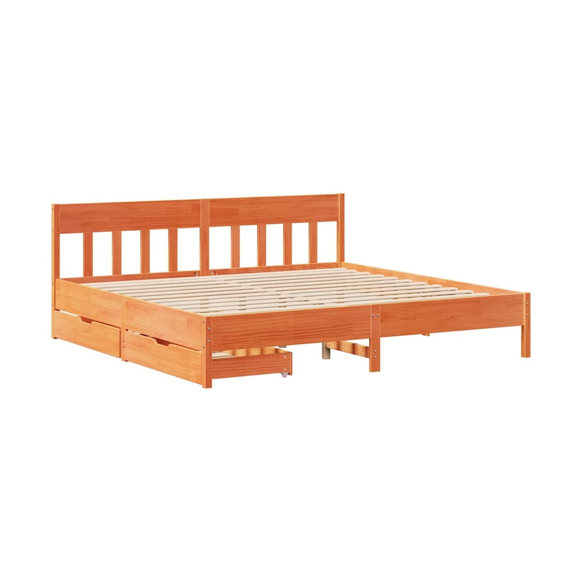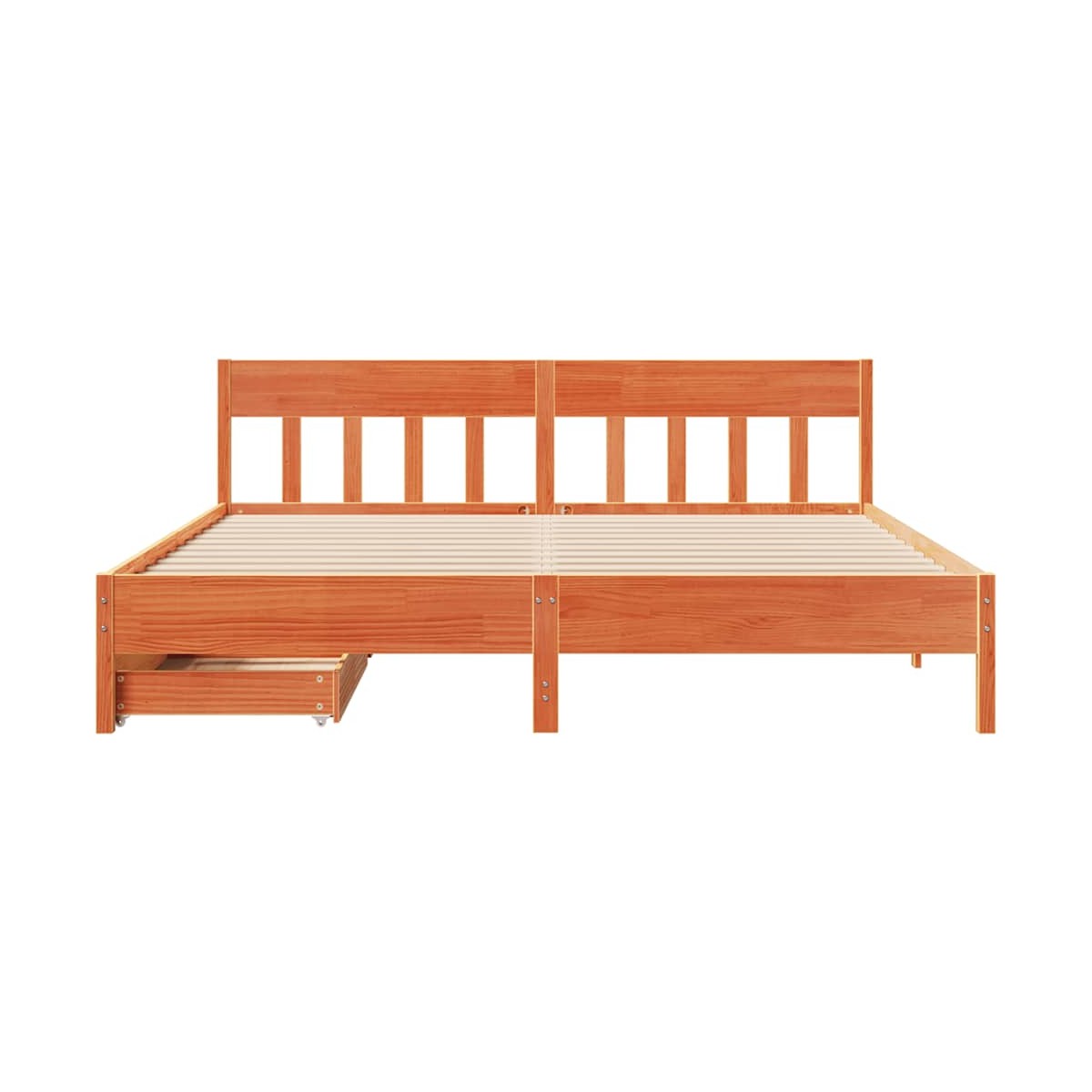 Consigue un sueño más reparador con esta estructura de cama. Es un aporte acogedor para cualquier dormitorio. Estructura estable y duradera: La madera de pino maciza es conocida por su resistencia y durabilidad. Sus vetas rectas y sus característicos nudos contribuyen a su encanto rústico.Somier de láminas para un soporte óptimo: La estructura de cama está equipada con un somier de láminas para el apoyo y la transpirabilidad del colchón.Cabecero versátil: Esta estructura de cama viene con un cabecero que proporciona un excelente soporte para la espalda cuando te sientas en la cama para leer o ver la televisión, a la vez que sirve como elemento decorativo.Aproveche al máximo el espacio: Este somier cuenta con dos cajones debajo, que proporcionan almacenamiento para artículos como ropa de cama extra, ropa de temporada y juguetes.Maniobrabilidad sin esfuerzo: Este cajón de almacenamiento bajo la cama cuenta con cuatro ruedas, que proporcionan una maniobrabilidad suave y sin esfuerzo para deslizarse dentro y fuera de debajo de tu cama. Información útil:El colchón no está incluido con la cama. Disponemos de una variada selección de colchones. Puedes echar un vistazo a nuestra tienda para buscar el colchón correspondiente.