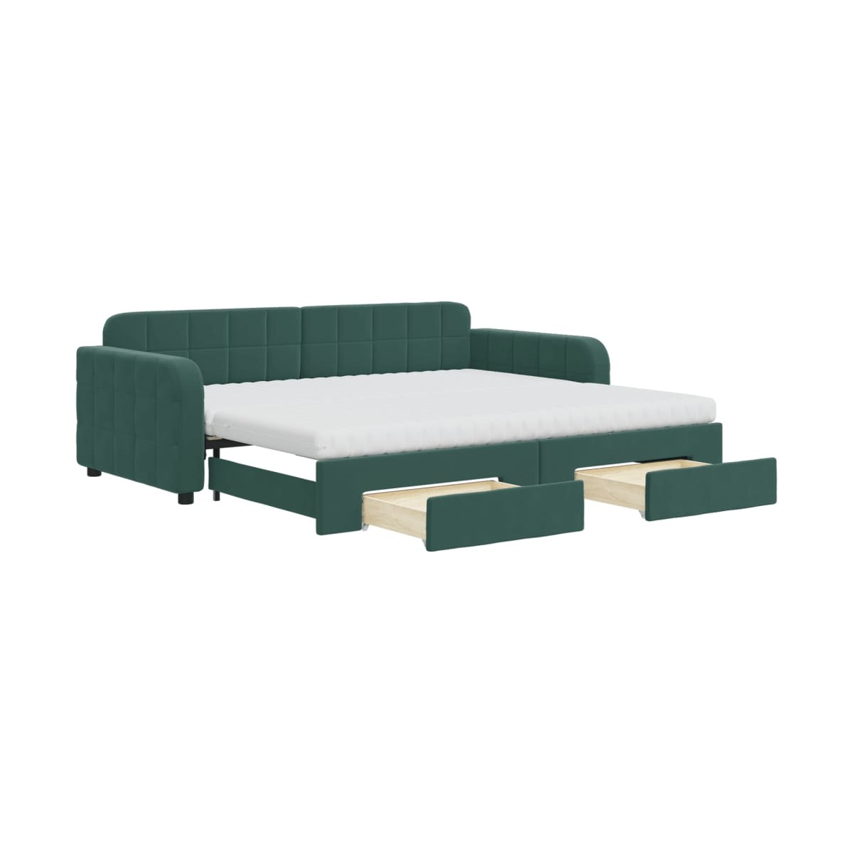Este sofá cama 2 en 1 con cama nido, que sirve como sofá y cama, es un complemento práctico y llamativo para tu salón o dormitorio. Sofá cama versátil: El sofá cama funciona como sofá durante el día y se convierte fácilmente en una cama doble por la noche sacando la cama nido, lo que proporciona una solución práctica para recibir invitados y maximizar el espacio.Amplio espacio de almacenamiento: Esta cama de invitados tiene dos cajones con ruedas que brindan un amplio espacio para guardar ropa, calcetines, juguetes, cojines, etc.Cómodo colchón de espuma: Esta cama se suministra con dos colchones de espuma para un máximo apoyo y una comodidad óptima.Terciopelo suave y construcción sólida: Este sofá cama tiene una estructura resistente hecha de madera y metal y está tapizado en terciopelo suave y cómodo.