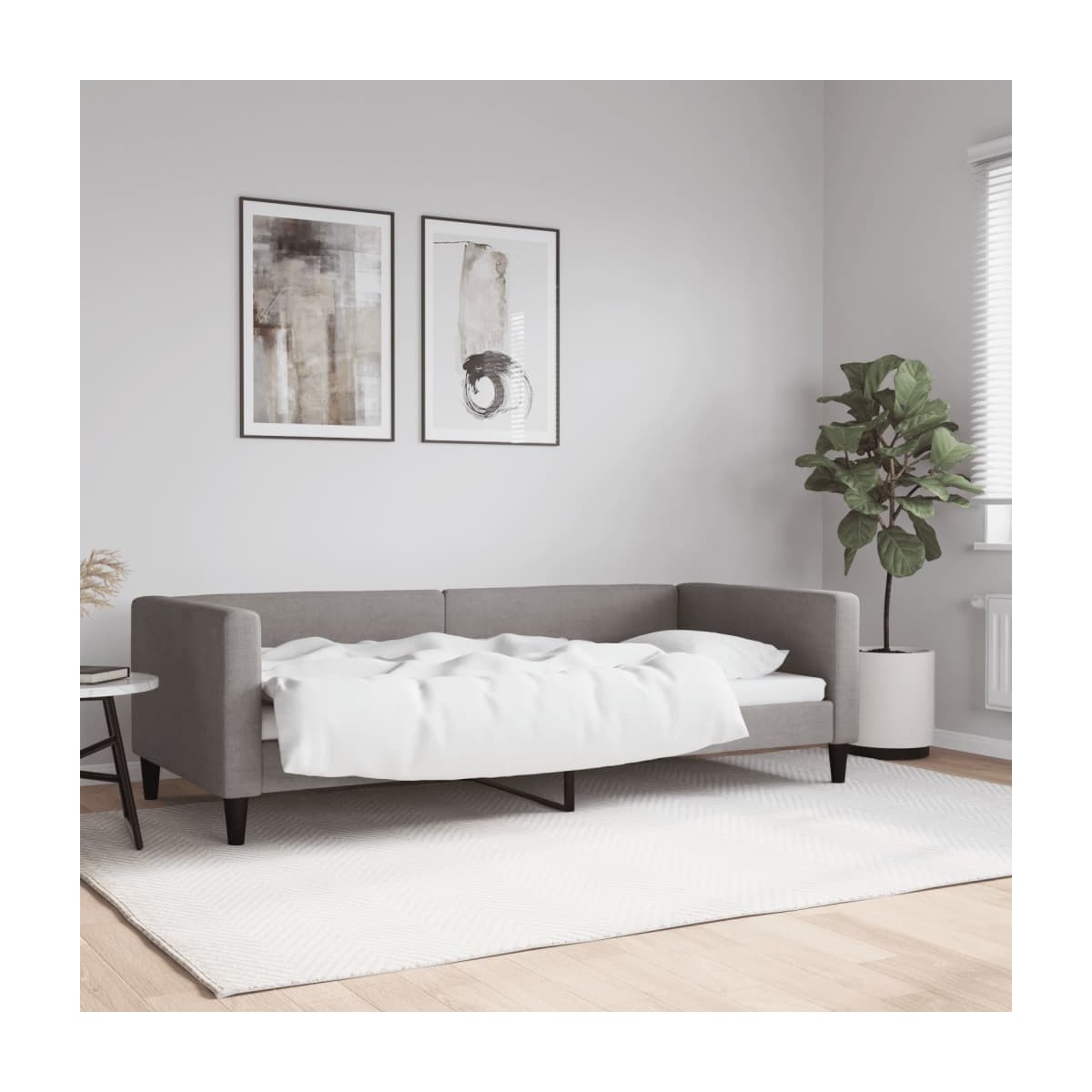 Este sofá cama 2 en 1, que sirve tanto de sofá como de cama, es un complemento práctico y llamativo para el salón o el dormitorio. Sofá cama versátil: El sofá cama puede utilizarse como sofá durante el día o como cama por la noche, para tener una solución rápida para alojar a invitados que pasen la noche.Experiencia confortable: El sofá cama está hecho de tela. La tela posee un aspecto sencillo y limpio, además de ser transpirable y duradera. Asimismo, el respaldo y los reposabrazos de la cama de invitados están acolchados con espuma para mejorar la comodidad.Estructura robusta y estable: La estructura principal del sofá cama está hecha de metal y madera maciza, por lo que es muy resistente y duradero. Estos listones de madera contrachapada permiten una mejor circulación del aire con el fin de mantener el colchón fresco durante más tiempo, además de mejorar la capacidad de peso y garantizar la estabilidad.Diseño moderno: ¡El sofá cama tiene un diseño moderno con líneas nítidas, un aspecto minimalista, así como luz natural, y añadirá un estilo moderno a la casa! Información útil:El colchón no está incluido con la cama. Disponemos de una variada selección de colchones. Puedes echar un vistazo a nuestra tienda para buscar el colchón correspondiente.