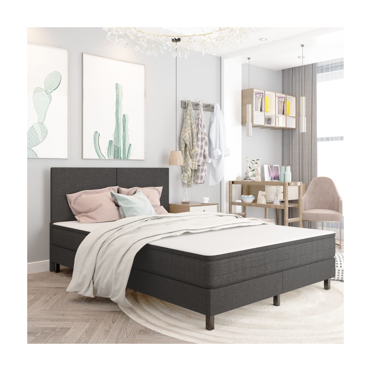 Esta cama box spring aporta un toque de encanto elegante a la decoración de tu dormitorio con un diseño discreto. La estructura de la cama, hecha de MDF y metal, es muy robusta y duradera. Tapizada con tela duradera y resistente, la cama emana un aspecto acogedor y es fácil de limpiar. Con un grosor extra de aprox. 20 cm, el sobrecolchón acolchado con muelles ensacados que absorben los golpes garantiza una buena noche de sueño. Está hecho de espuma diseñada especialmente, con capas que alivian el estrés sobre los puntos de presión. El diseño de muelles internos posee muelles extra que proporcionan un soporte óptimo. También es una excelente solución para personas con mucho peso o que sufren de sudoración excesiva. El colchón recupera la forma después de aplicar presión. Además, el sobrecolchón se puede quitar fácilmente con la cremallera para limpiarlo. Este producto es fácil de montar. Ten en cuenta: Por razones de higiene, el colchón y el sobrecolchón no pueden devolverse si se retira o se abre el embalaje.