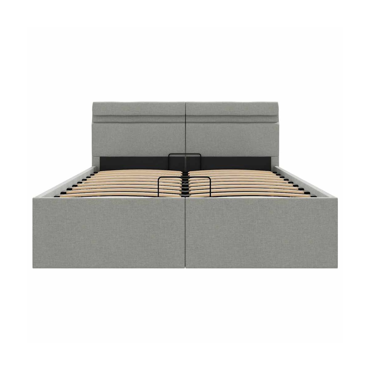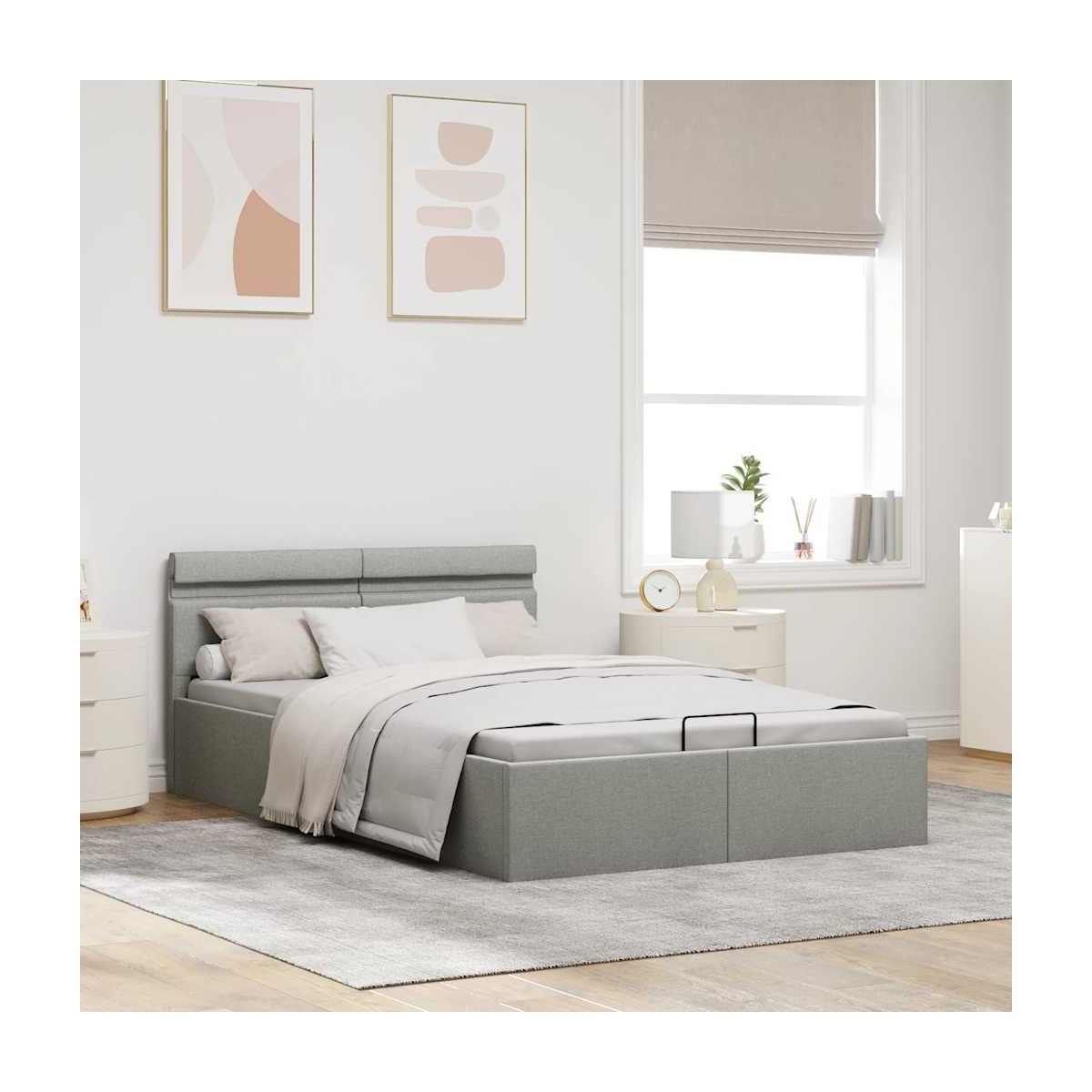 ¡Añade al instante un impresionante toque moderno a tu dormitorio con nuestra estructura de cama hidráulica de tela! Esta cama de matrimonio se caracteriza por un diseño sencillo pero elegante, así como una estructura maciza ya que está hecha de MDF resistente y robusto. Esta cama tapizada convierte el espacio no utilizado debajo del colchón en espacio de almacenamiento, con un amplio espacio para guardar ropa, sábanas, mantas, etc. El mecanismo hidráulico de elevación de gas hace que levantar el colchón sea muy fácil. El somier permanecerá en posición vertical una vez que lo hayas levantado para que tengas ambas manos libres para retirar o guardar objetos debajo. La estructura de acero con recubrimiento en polvo y los listones de madera contrachapada aportan solidez y durabilidad a la cama. Tapizada con tela duradera, esta cama con almacenaje tiene un aspecto acogedor y es fácil de mantener. Este producto es fácil de montar. Este mueble para el dormitorio es adecuado para un colchón de 140 x 200 cm. Asimismo, puedes ajustar cómodamente la potencia, el brillo y los diferentes colores intermitentes de la tira de luz LED con el mando a distancia de 24 teclas incluido para crear un espectáculo de luces alucinante. Ten en cuenta que la entrega solo incluye la estructura de cama; el colchón no está incluido. Puedes buscar uno apropiado para ella en nuestra tienda. Nota: El producto tiene un conector USB, pero la fuente de alimentación USB de 5V certificada no está incluida.