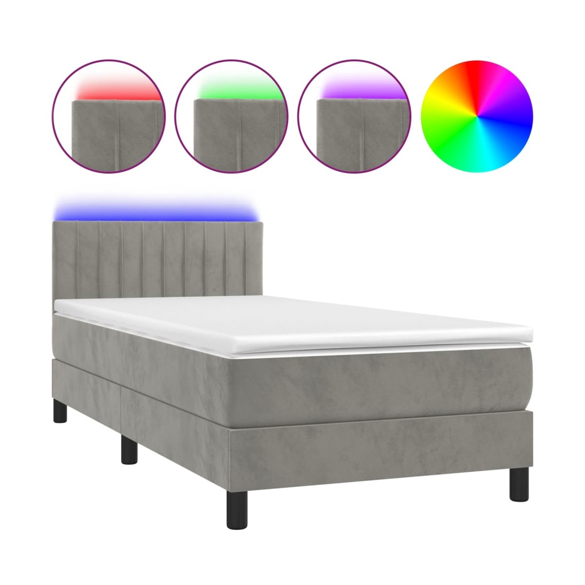 Utiliza esta cama box spring con colchón y LED para disfrutar de un sueño reparador. Es el centro de atención de tu dormitorio. Terciopelo suave: El terciopelo es una tela suave y lujosa, reconocida por su denso pelo de fibras cortadas de forma uniforme que tienen una suave pelusa. La tela de terciopelo posee un característico y suave tacto, lo que hace que sea cómoda al tacto.Cabecero práctico: El cabecero de la cama es ajustable en altura según tus preferencias. El cabecero de la cama te proporciona un excelente apoyo para la espalda mientras estás sentado en la cama para leer o ver la televisión.Tira de LED de colores: Alegra la oscuridad con luces LED de colores.Colchón de muelles ensacados: El muelle ensacado individual incorporado es conocido por su altísima calidad, al tiempo que garantiza un alto nivel de durabilidad y adaptabilidad. Puede absorber eficazmente el ruido y los golpes causados por los lanzamientos y los giros.Protector de colchón respetuoso con la piel: El protector de colchón tiene una funda de tejido resistente y respetuoso con la piel, que lo hace suave y confortable. Nota:Por razones de higiene, el colchón no puede devolverse si se ha quitado o abierto el embalaje.Cada producto viene con un manual de montaje en la caja para facilitar el montaje.Únicamente puedes cortar por la parte con el símbolo de las tijeras y únicamente la parte con el USB seguirá funcionando como antes.El producto tiene un conector USB, pero no se incluye la fuente de alimentación USB de 5 V certificada.