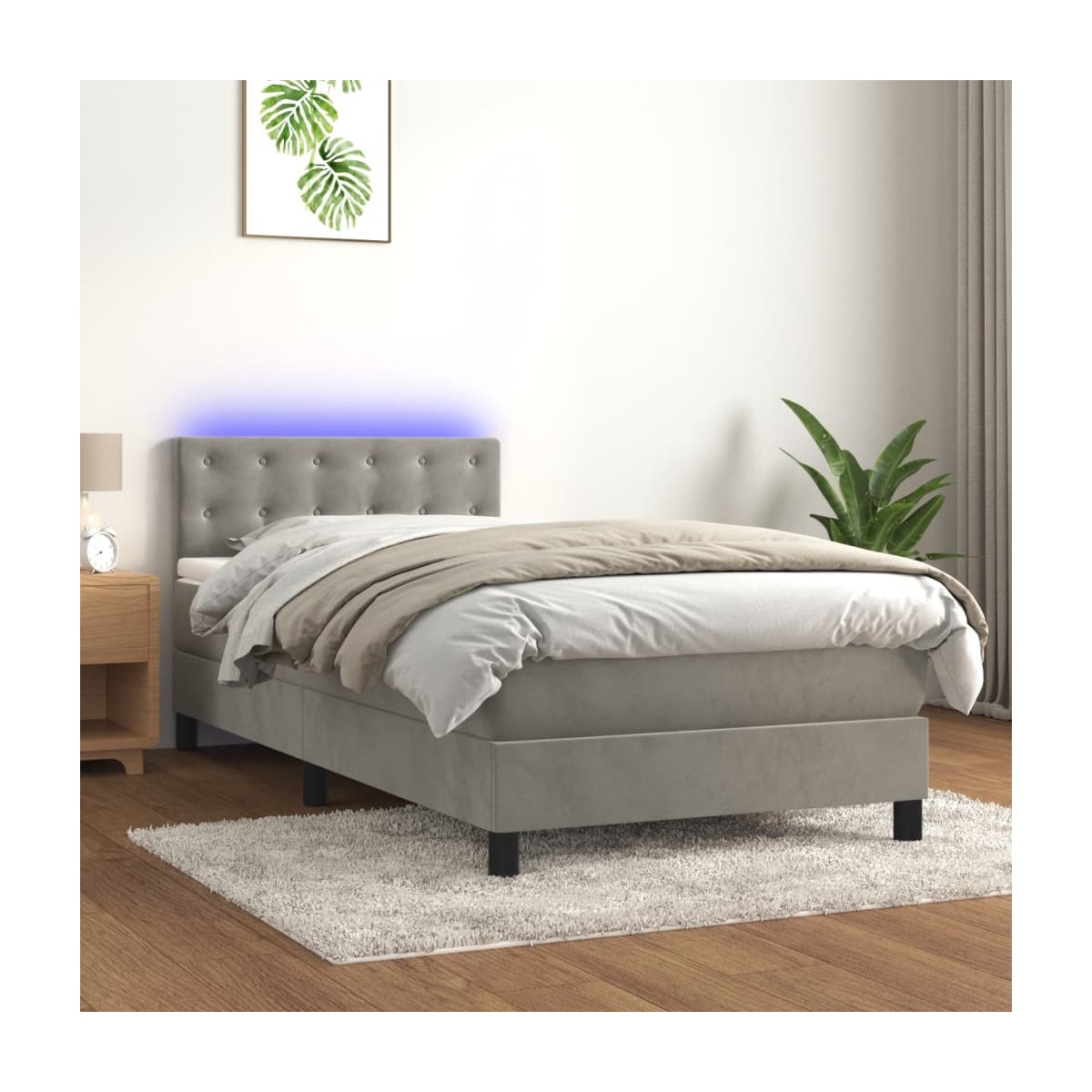 Utiliza esta cama box spring con colchón y LED para disfrutar de un sueño reparador. Es el centro de atención de tu dormitorio. Terciopelo suave: El terciopelo es una tela suave y lujosa, reconocida por su denso pelo de fibras cortadas de forma uniforme que tienen una suave pelusa. La tela de terciopelo posee un característico y suave tacto, lo que hace que sea cómoda al tacto.Cabecero práctico: El cabecero de la cama es ajustable en altura según tus preferencias. El cabecero de la cama te proporciona un excelente apoyo para la espalda mientras estás sentado en la cama para leer o ver la televisión.Tira de LED de colores: Alegra la oscuridad con luces LED de colores.Colchón de muelles ensacados: El muelle ensacado individual incorporado es conocido por su altísima calidad, al tiempo que garantiza un alto nivel de durabilidad y adaptabilidad. Puede absorber eficazmente el ruido y los golpes causados por los lanzamientos y los giros.Protector de colchón respetuoso con la piel: El protector de colchón tiene una funda de tejido resistente y respetuoso con la piel, que lo hace suave y confortable. Nota:Por razones de higiene, el colchón no puede devolverse si se ha quitado o abierto el embalaje.Cada producto viene con un manual de montaje en la caja para facilitar el montaje.Únicamente puedes cortar por la parte con el símbolo de las tijeras y únicamente la parte con el USB seguirá funcionando como antes.El producto tiene un conector USB, pero no se incluye la fuente de alimentación USB de 5 V certificada.