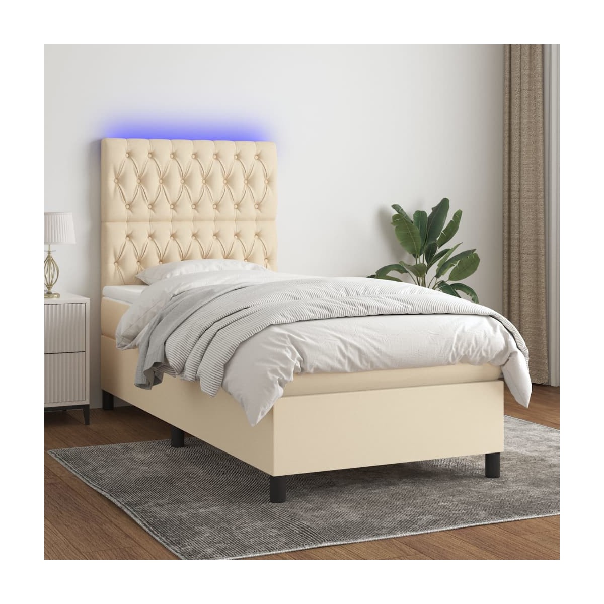 Utiliza esta cama box spring con colchón y LED para disfrutar de un sueño reparador. Es el centro de atención de tu dormitorio. Material de primera calidad: La tela posee un aspecto sencillo y limpio, y es transpirable y duradera.Cabecero práctico: El cabecero de la cama es ajustable en altura según tus preferencias. El cabecero de la cama te proporciona un excelente apoyo para la espalda mientras estás sentado en la cama para leer o ver la televisión.Tira de LED de colores: Alegra la oscuridad con luces LED de colores.Colchón de muelles ensacados: El muelle ensacado individual incorporado es conocido por su altísima calidad, al tiempo que garantiza un alto nivel de durabilidad y adaptabilidad. Puede absorber eficazmente el ruido y los golpes causados por los lanzamientos y los giros.Protector de colchón respetuoso con la piel: El protector de colchón tiene una funda de tejido resistente y respetuoso con la piel, que lo hace suave y confortable. Nota:Por razones de higiene, el colchón no puede devolverse si se ha quitado o abierto el embalaje.Únicamente puedes cortar por la parte con el símbolo de las tijeras y únicamente la parte con el USB seguirá funcionando como antes.Cada producto viene con un manual de montaje en la caja para facilitar el montaje.El producto tiene un conector USB, pero no se incluye la fuente de alimentación USB de 5 V certificada.