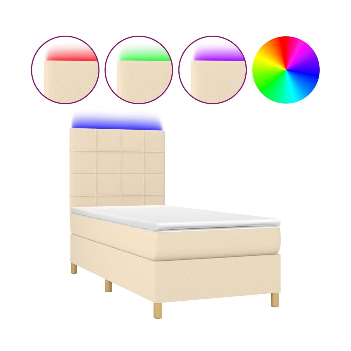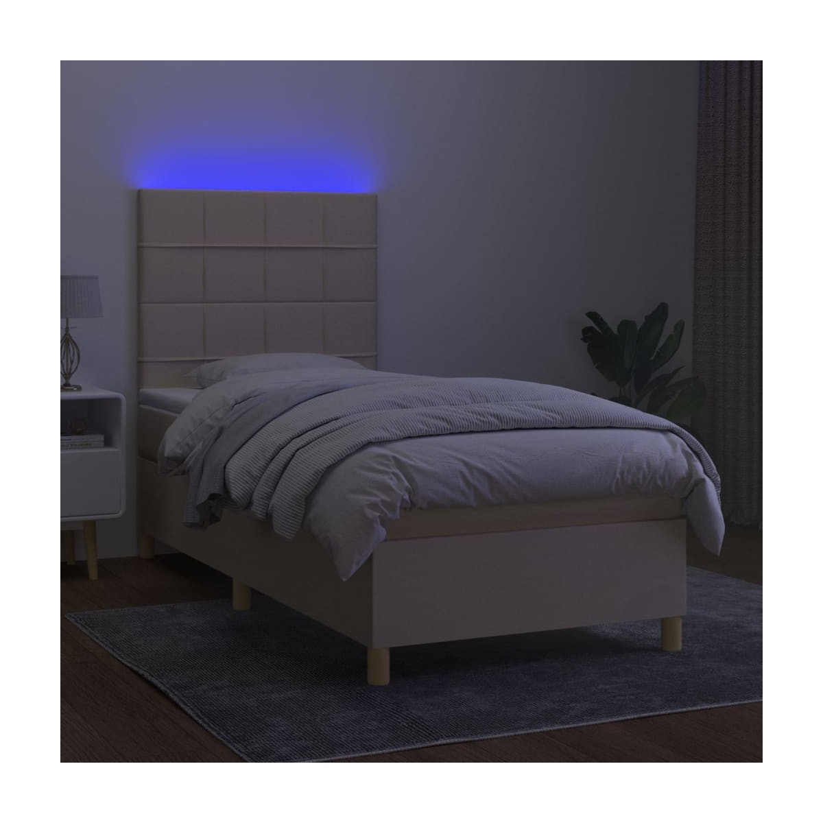 Utiliza esta cama box spring con colchón y LED para disfrutar de un sueño reparador. Es el centro de atención de tu dormitorio. Material de primera calidad: La tela posee un aspecto sencillo y limpio, y es transpirable y duradera.Cabecero práctico: El cabecero de la cama es ajustable en altura según tus preferencias. El cabecero de la cama te proporciona un excelente apoyo para la espalda mientras estás sentado en la cama para leer o ver la televisión.Tira de LED de colores: Alegra la oscuridad con luces LED de colores.Colchón de muelles ensacados: El muelle ensacado individual incorporado es conocido por su altísima calidad, al tiempo que garantiza un alto nivel de durabilidad y adaptabilidad. Puede absorber eficazmente el ruido y los golpes causados por los lanzamientos y los giros.Protector de colchón respetuoso con la piel: El protector de colchón tiene una funda de tejido resistente y respetuoso con la piel, que lo hace suave y confortable. Nota:Por razones de higiene, el colchón no puede devolverse si se ha quitado o abierto el embalaje.Únicamente puedes cortar por la parte con el símbolo de las tijeras y únicamente la parte con el USB seguirá funcionando como antes.Cada producto viene con un manual de montaje en la caja para facilitar el montaje.El producto tiene un conector USB, pero no se incluye la fuente de alimentación USB de 5 V certificada.