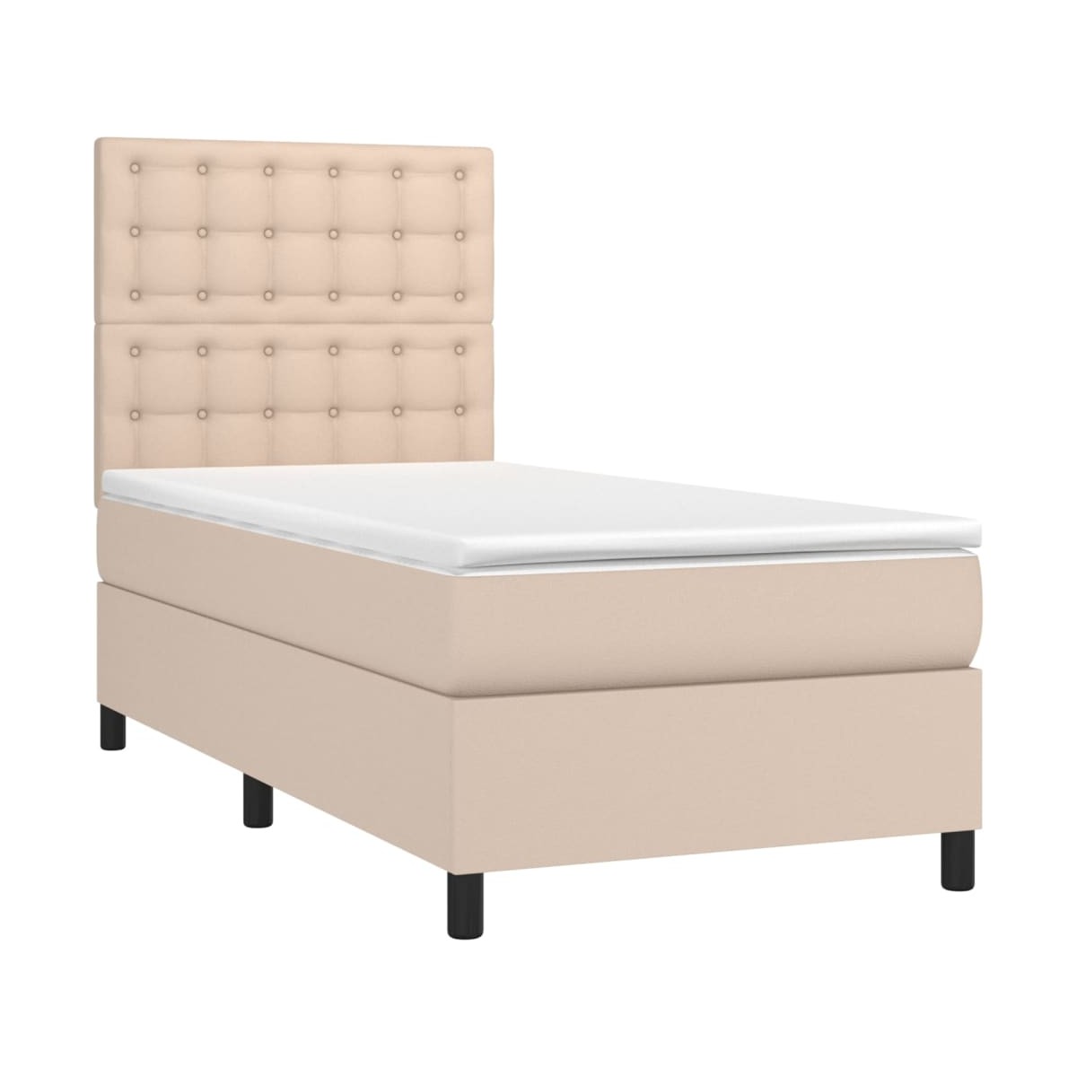 Utiliza esta cama box spring con colchón y LED para disfrutar de un sueño reparador. Es el centro de atención de tu dormitorio. Material duradero: El cuero sintético de primera calidad es un material muy duradero. Es resistente a las manchas, por lo que es fácil de limpiar con un paño húmedo. Además, la superficie lisa da un aspecto lujoso y la belleza del cuero auténtico.Cabecero práctico: El cabecero de la cama es ajustable en altura según tus preferencias. El cabecero de la cama te proporciona un excelente apoyo para la espalda mientras estás sentado en la cama para leer o ver la televisión.Tira de LED de colores: Alegra la oscuridad con luces LED de colores.Colchón de muelles ensacados: El muelle ensacado individual incorporado es conocido por su altísima calidad, al tiempo que garantiza un alto nivel de durabilidad y adaptabilidad. Puede absorber eficazmente el ruido y los golpes causados por los lanzamientos y los giros.Protector de colchón respetuoso con la piel: El protector de colchón tiene una funda de tejido resistente y respetuoso con la piel, que lo hace suave y confortable. Nota:Por razones de higiene, el colchón no puede devolverse si se ha quitado o abierto el embalaje.Únicamente puedes cortar por la parte con el símbolo de las tijeras y únicamente la parte con el USB seguirá funcionando como antes.Cada producto viene con un manual de montaje en la caja para facilitar el montaje.El producto tiene un conector USB, pero no se incluye la fuente de alimentación USB de 5 V certificada.