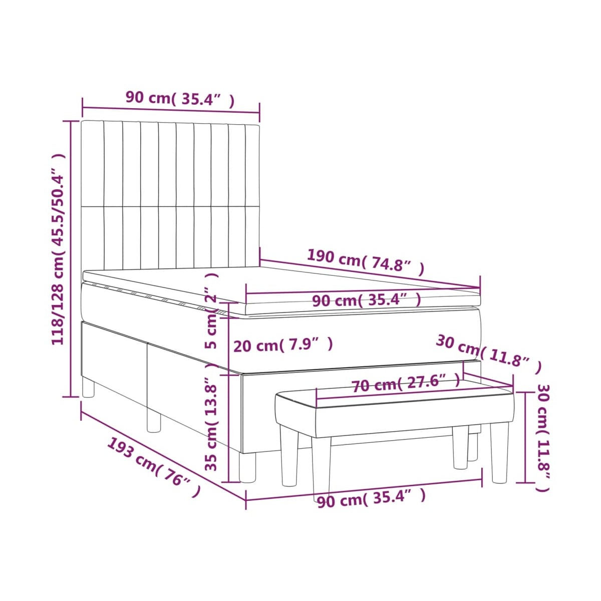Utiliza esta cama de muelles para disfrutar de un sueño reparador. Te ofrece la máxima relajación y un sueño placentero. Terciopelo suave: El terciopelo es una tela suave y lujosa, reconocida por su denso pelo de fibras cortadas de forma uniforme que tienen una suave pelusa. La tela de terciopelo posee un característico y suave tacto, lo que hace que sea cómoda al tacto.Cabecero práctico: El cabecero de la cama es ajustable en altura según tus preferencias. El cabecero de la cama te proporciona un excelente apoyo para la espalda mientras estás sentado en la cama para leer o ver la televisión.Colchón de muelles ensacados: El muelle ensacado individual incorporado es conocido por su altísima calidad, al tiempo que garantiza un alto nivel de durabilidad y adaptabilidad. Puede absorber eficazmente el ruido y los golpes causados por los lanzamientos y los giros.Soporte de dureza media: El colchón de la cama proporciona perfectamente una mayor estabilidad y el nivel justo de firmeza sin sacrificar la comodidad. Por tanto, es ideal para quienes duermen de espaldas o boca abajo.Protector de colchón respetuoso con la piel: El protector de colchón tiene una funda de tejido resistente y respetuoso con la piel, que lo hace suave y confortable.Banco multifuncional: Este banco puede servir como asiento adicional en tu casa. Además, puede utilizarse como banco de pie de cama. Nota:Por razones de higiene, el colchón no puede devolverse si se ha quitado o abierto el embalaje.Cada producto viene con un manual de montaje en la caja para facilitar el montaje.