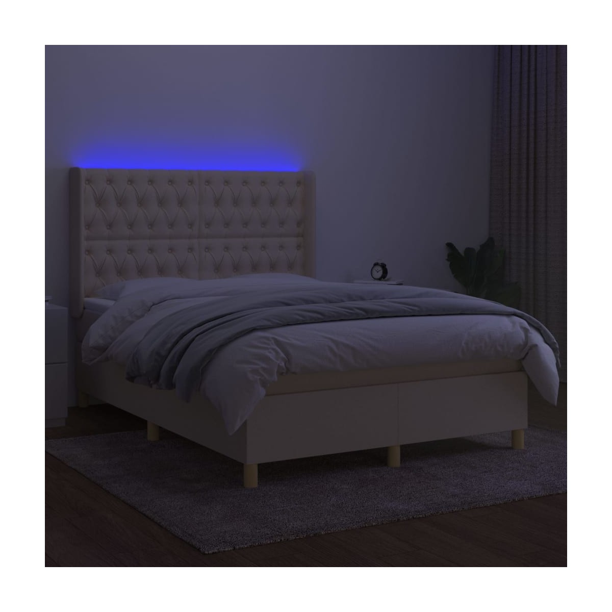 Utiliza esta cama box spring con colchón y LED para disfrutar de un sueño reparador. Es el centro de atención de tu dormitorio. Material de primera calidad: La tela posee un aspecto sencillo y limpio, y es transpirable y duradera.Cabecero práctico: El cabecero de la cama es ajustable en altura según tus preferencias. El cabecero de la cama te proporciona un excelente apoyo para la espalda mientras estás sentado en la cama para leer o ver la televisión.Tira de LED de colores: Alegra la oscuridad con luces LED de colores.Colchón de muelles ensacados: El muelle ensacado individual incorporado es conocido por su altísima calidad, al tiempo que garantiza un alto nivel de durabilidad y adaptabilidad. Puede absorber eficazmente el ruido y los golpes causados por los lanzamientos y los giros.Protector de colchón respetuoso con la piel: El protector de colchón tiene una funda de tejido resistente y respetuoso con la piel, que lo hace suave y confortable. Nota:Por razones de higiene, el colchón no puede devolverse si se ha quitado o abierto el embalaje.Únicamente puedes cortar por la parte con el símbolo de las tijeras y únicamente la parte con el USB seguirá funcionando como antes.Cada producto viene con un manual de montaje en la caja para facilitar el montaje.El producto tiene un conector USB, pero no se incluye la fuente de alimentación USB de 5 V certificada.