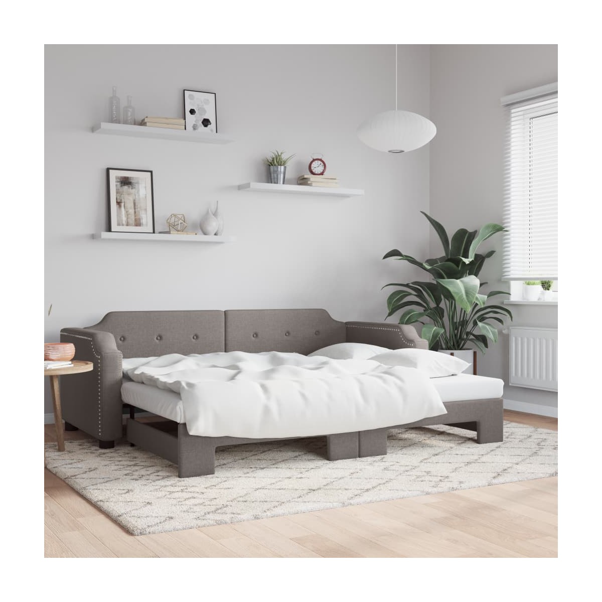 Este sofá cama 2 en 1 con cama nido, que sirve como sofá y cama, es un complemento práctico y llamativo para tu salón o dormitorio. Sofá cama versátil: El sofá cama funciona como sofá durante el día y se convierte fácilmente en una cama doble por la noche sacando la cama nido, lo que proporciona una solución práctica para recibir invitados y maximizar el espacio. Tela duradera: La cama de invitados está hecha de tela, que posee un aspecto sencillo y limpio, además de ser transpirable y duradera. Construcción maciza: La estructura de madera y metal de la cama nido garantiza su solidez y estabilidad. Información útil:Los colchones no están incluidos en este sofá cama. Ofrecemos una variada selección de colchones. Puedes echar un vistazo a nuestra tienda para buscar el correspondiente colchón.