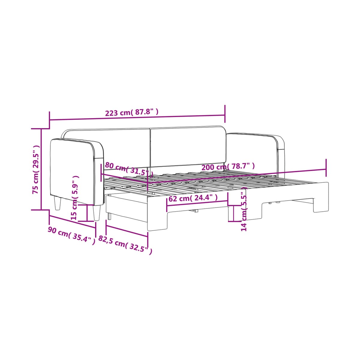 - Dimensiones (no extendido): 223 x 90 x 75 cm (largo x ancho x alto)