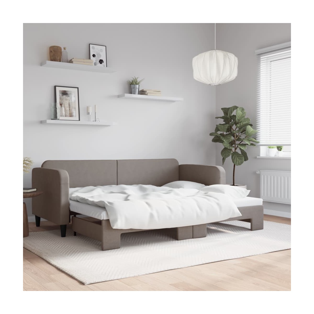 Este sofá cama 2 en 1 con cama nido, que sirve como sofá y cama, es un complemento práctico y llamativo para tu salón o dormitorio. Sofá cama versátil: El sofá cama funciona como sofá durante el día y se convierte fácilmente en una cama doble por la noche sacando la cama nido, lo que proporciona una solución práctica para recibir invitados y maximizar el espacio.Tela duradera: La cama de invitados está hecha de tela, que posee un aspecto sencillo y limpio, además de ser transpirable y duradera.Construcción maciza: La estructura de madera y metal de la cama nido garantiza su solidez y estabilidad. Información útil:Los colchones no están incluidos en este sofá cama. Ofrecemos una variada selección de colchones. Puedes echar un vistazo a nuestra tienda para buscar el correspondiente colchón.