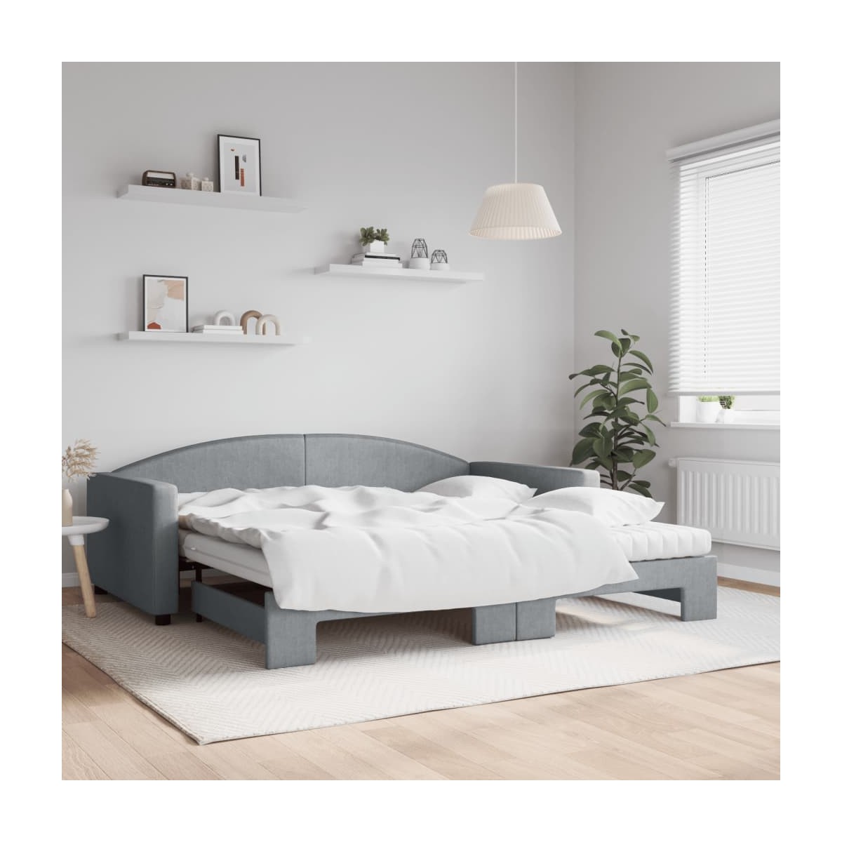 Este sofá cama 2 en 1 con cama nido, que sirve como sofá y cama, es un complemento práctico y llamativo para tu salón o dormitorio. Sofá cama versátil: El sofá cama funciona como sofá durante el día y se convierte fácilmente en una cama doble por la noche sacando la cama nido, lo que proporciona una solución práctica para recibir invitados y maximizar el espacio.Cómodo colchón de espuma: Esta cama se suministra con dos colchones de espuma para un máximo apoyo y una comodidad óptima.Tela duradera y construcción sólida: Este sofá cama tiene una estructura resistente hecha de madera y metal y está tapizado con una tela duradera y cómoda.Diseño moderno: ¡El sofá cama tiene un diseño moderno con líneas nítidas, un aspecto minimalista, así como luz natural, y añadirá un estilo moderno a la casa!