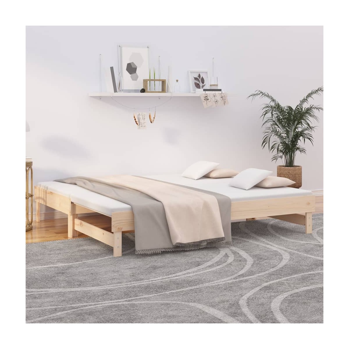 Este versátil sofá cama de madera se puede usar como cama en el dormitorio y también encaja a la perfección como sofá en el salón. Madera maciza de pino: La madera maciza de pino es un bonito material natural. La madera de pino tiene vetas rectas, y los nudos dan al material su distintivo aspecto rústico. Esta cama para invitados está hecha de madera maciza de pino, más estable y duradera.Sofá cama extraíble: Este sofá cama de madera se puede utilizar como sofá durante el día o como cama por la noche. Es una solución rápida para alojar invitados por la noche sin ocupar mucho espacio.Diseño de láminas: El somier de láminas proporciona una mejor circulación del aire para mantener el colchón fresco durante más tiempo, y mejora así la capacidad de peso de la cama auxiliar y asegura su estabilidad.Uso sencillo: Este sofá cama resulta muy práctico de usar y no necesita un canapé ni una base. ¡Tan solo coloca el colchón encima y disfruta de un sueño reparador o descansa sentado! Nota:Ten en cuenta que la entrega incluye únicamente una estructura de cama. El colchón no está incluido. Puedes echar un vistazo a nuestra tienda para buscar el correspondiente colchón.Cada producto viene con un manual de montaje en la caja para facilitar el montaje.