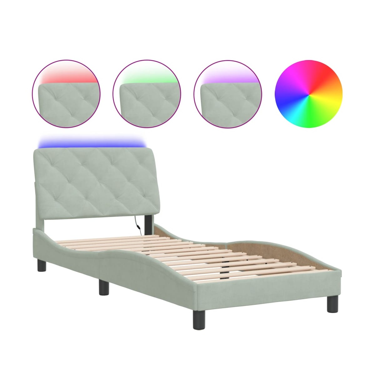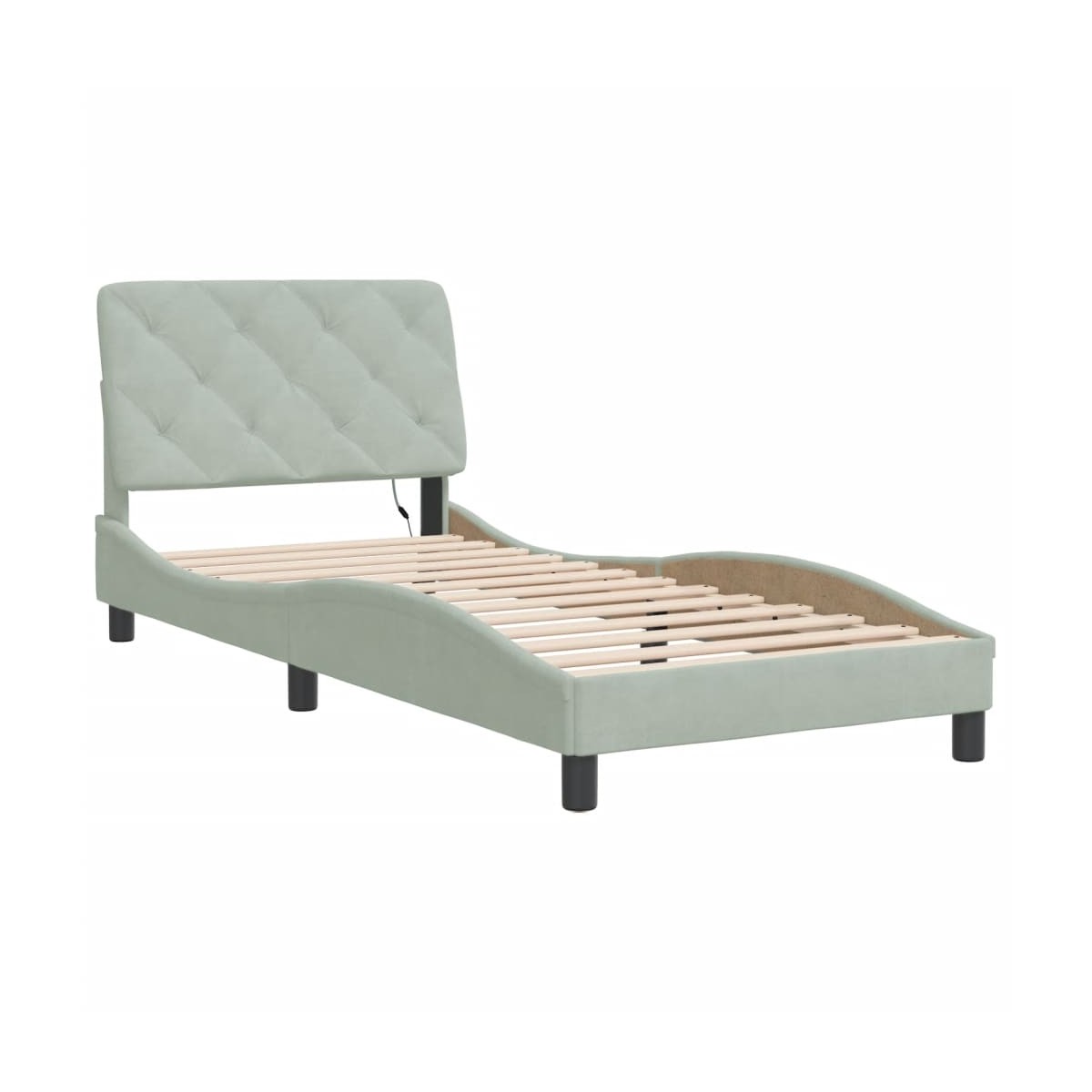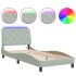 ¡Consigue tener un sueño reparador con esta estructura de cama con luces LED! Es un aporte acogedor para cualquier dormitorio. Terciopelo suave: El terciopelo es una tela suave y cálida, agradable al tacto. Listones robustos: Los listones de madera contrachapada proporcionan una buena distribución del peso, lo que garantiza que el colchón se mantenga en tu sitio con cada giro y vuelta del cuerpo mientras duermes. Excelente soporte: El cabecero acolchado está relleno de espuma para una comodidad ultrasuave y óptima, lo que te brinda un excelente soporte para la espalda mientras estás sentado en la cama para leer o ver la televisión. Tira de LED de colores: Alegra la oscuridad con luces LED de colores. Los cierres de gancho y bucle de la parte posterior del cojín del cabecero se pueden utilizar para fijar las luces LED. Diseño lateral ondulado: El look ondulado de la estructura de la cama es elegante y sofisticado, agregando un toque moderno y elegante a tu decoración, convirtiéndolo en el foco de atención de tu dormitorio. Información útil:El colchón no está incluido con la cama. Disponemos de una variada selección de colchones. Puedes echar un vistazo a nuestra tienda para buscar el colchón correspondiente.El producto tiene un conector USB que necesita una fuente de alimentación USB certificada de 5 V (no incluida).