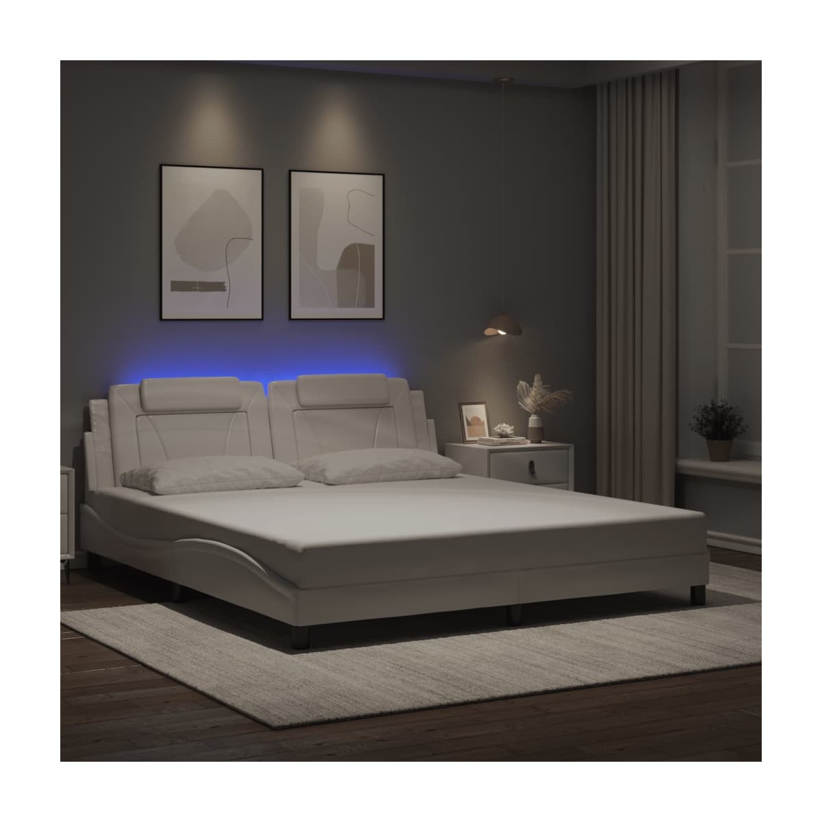 ¡Consigue tener un sueño reparador con esta estructura de cama con luces LED! Es un aporte acogedor para cualquier dormitorio. Material duradero: El cuero sintético de primera calidad es un material muy duradero. Es resistente a las manchas, por lo que es fácil de limpiar con un paño húmedo. Además, la superficie lisa da un aspecto lujoso y la belleza del cuero auténtico.Listones robustos: Los listones de madera contrachapada proporcionan una buena distribución del peso, lo que garantiza que el colchón se mantenga en tu sitio con cada giro y vuelta del cuerpo mientras duermes. Excelente soporte: El cabecero acolchado está relleno de espuma para una comodidad ultrasuave y óptima, lo que te brinda un excelente soporte para la espalda mientras estás sentado en la cama para leer o ver la televisión. Tira de LED de colores: Alegra la oscuridad con luces LED de colores. Los cierres de gancho y bucle de la parte posterior del cojín del cabecero se pueden utilizar para fijar las luces LED. Diseño lateral ondulado: El look ondulado de la estructura de la cama es elegante y sofisticado, agregando un toque moderno y elegante a tu decoración, convirtiéndolo en el foco de atención de tu dormitorio. Información útil:El colchón no está incluido con la cama. Disponemos de una variada selección de colchones. Puedes echar un vistazo a nuestra tienda para buscar el colchón correspondiente.El producto tiene un conector USB que necesita una fuente de alimentación USB certificada de 5 V (no incluida).