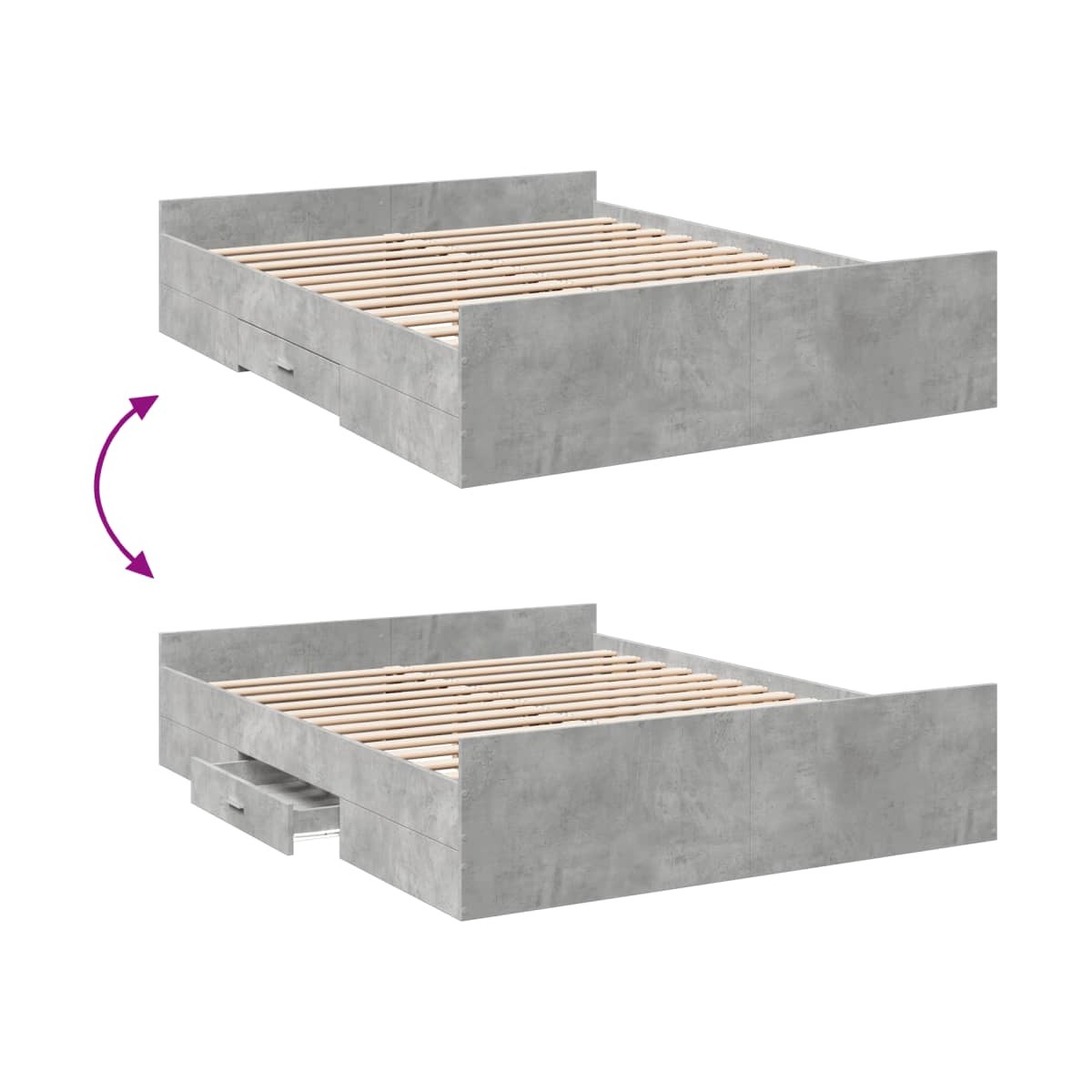 ¡Añade un toque moderno a tu dormitorio con esta estructura de cama con cajones! Es un aporte práctico y decorativo para tu hogar. Material duradero: La estructura de la cama está hecha de madera de ingeniería. La madera de ingeniería tiene una calidad excepcional, con una superficie lisa y también con fuerza, estabilidad y resistencia a la humedad.Listones robustos: Los listones de madera contrachapada proporcionan una buena distribución del peso, lo que garantiza que el colchón se mantenga en tu sitio con cada giro y vuelta del cuerpo mientras duermes.Función de almacenaje: Los cajones de cama incluidos proporcionan amplio espacio de almacenamiento para guardar cosas básicas, y mantienen la habitación limpia y ordenada. Información útil:El colchón no está incluido con la cama. Disponemos de una variada selección de colchones. Puedes echar un vistazo a nuestra tienda para buscar el colchón correspondiente.