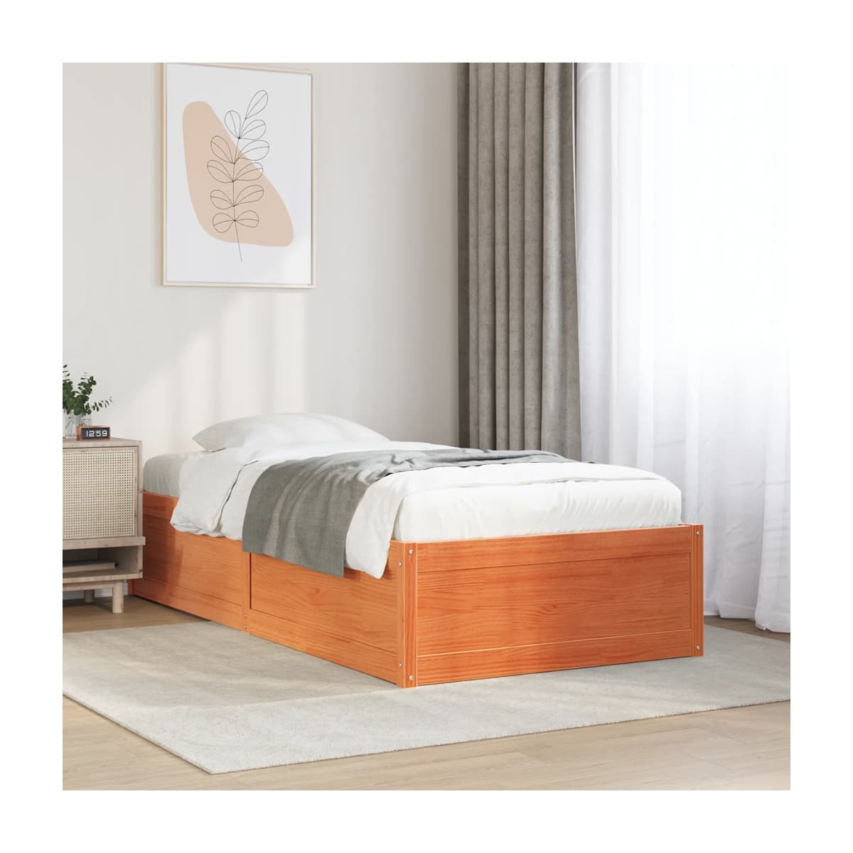 ¡Añade un toque moderno a tu dormitorio con esta estructura de cama! Es un aporte práctico y decorativo para tu hogar. Estructura estable y duradera: La madera de pino maciza es conocida por su resistencia y durabilidad. Sus vetas rectas y sus característicos nudos contribuyen a su encanto rústico.Listones robustos: Los listones de madera contrachapada proporcionan una buena distribución del peso, lo que garantiza que el colchón se mantenga en tu sitio con cada giro y vuelta del cuerpo mientras duermes.Diseño moderno: ¡Da un estilo moderno a tu casa! El moderno diseño posee líneas limpias, aspectos minimalistas y luz natural como parte del estilo de interiorismo. Información útil:El colchón no está incluido con la cama. Disponemos de una variada selección de colchones. Puedes echar un vistazo a nuestra tienda para buscar el colchón correspondiente.