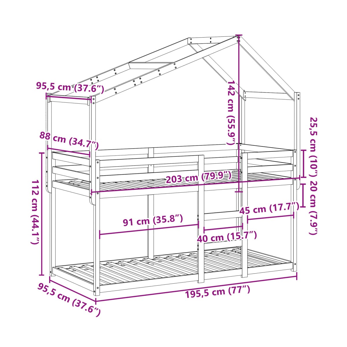 Esta litera infantil con techo es elegante y funcional, por lo que es un aporte perfecto para cualquier habitación con espacio limitado. Madera de pino maciza: La madera de pino maciza es un bonito material natural. La madera de pino tiene vetas rectas, y los nudos dan al material su distintivo aspecto rústico.Diseño seguro: La cama alta está diseñada pensando en la seguridad. Cuenta con barandillas para evitar que el usuario salga rodando mientras duerme.Listones robustos: Los listones de madera contrachapada proporcionan una buena distribución del peso, lo que garantiza que el colchón se mantenga en tu sitio con cada giro y vuelta del cuerpo mientras duermes.Gran diversión: Al combinar el techo con la cama de tu hijo, puedes crear un escondite que le ofrezca a tu hijo mucha diversión a la hora de acostarse. Este innovador añadido al cuarto no solo será un punto emocionante, sino que también traerá asombro y emoción a la habitación de los niños.Adecuado para espacios limitados: La estructura de cama es una excelente opción para cualquier habitación con espacio limitado, ya que proporciona dos camas individuales con un diseño compacto.Puerta lateral abierta: El techo cuenta con una puerta lateral abierta, lo que facilita el acceso para que tus hijos entren y salgan de la cama. Información útil:El colchón no está incluido con la cama. Disponemos de una variada selección de colchones. Puedes echar un vistazo a nuestra tienda para buscar el colchón correspondiente.