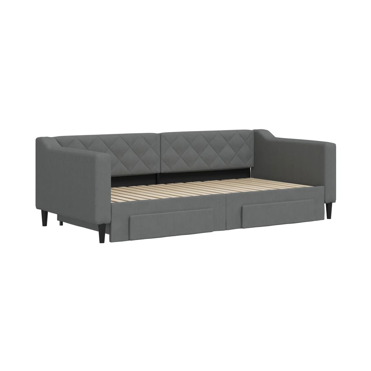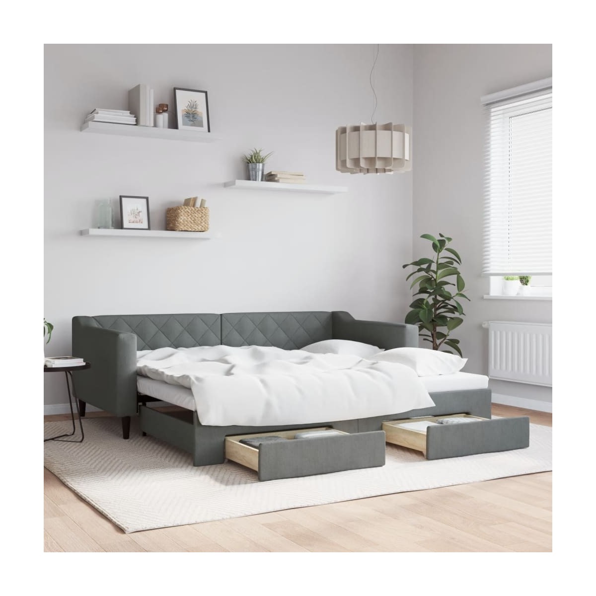 Este sofá cama 2 en 1 con cama nido, que sirve como sofá y cama, es un complemento práctico y llamativo para tu salón o dormitorio. Sofá cama versátil: El sofá cama funciona como sofá durante el día y se convierte fácilmente en una cama doble por la noche sacando la cama nido, lo que proporciona una solución práctica para recibir invitados y maximizar el espacio. Amplio espacio de almacenamiento: Esta cama de invitados tiene dos cajones con ruedas que brindan un amplio espacio para guardar ropa, calcetines, juguetes, cojines, etc. Tela duradera y construcción sólida: Este sofá cama tiene una estructura resistente hecha de madera y metal y está tapizado con una tela duradera y cómoda.Diseño moderno: ¡El sofá cama tiene un diseño moderno con líneas nítidas, un aspecto minimalista y añadirá un estilo moderno a la casa! Información útil:El colchón no está incluido con la cama. Ofrecemos una variada selección de colchones. Puedes echar un vistazo a nuestra tienda para buscar el correspondiente colchón.