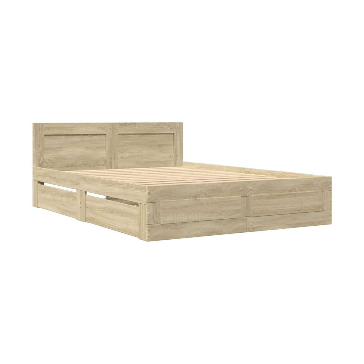Consigue un sueño más reparador con esta estructura de cama. Es un aporte acogedor para cualquier dormitorio. Material duradero: La estructura de la cama está hecha de madera de ingeniería. La madera de ingeniería tiene una calidad excepcional, con una superficie lisa y también con fuerza, estabilidad y resistencia a la humedad.Somier de láminas para un soporte óptimo: La estructura de cama está equipada con un somier de láminas para el apoyo y la transpirabilidad del colchón.Función de almacenamiento: Este somier ofrece cajones para mantener tus revistas, libros, juguetes y otros objetos pequeños bien organizados.Excelente apoyo: El cabecero de la cama te ofrece un excelente soporte para la espalda mientras estás sentado en la cama leyendo o mirando televisión. Información útil:El colchón no está incluido con la cama. Disponemos de una variada selección de colchones. Puedes echar un vistazo a nuestra tienda para buscar el colchón correspondiente.