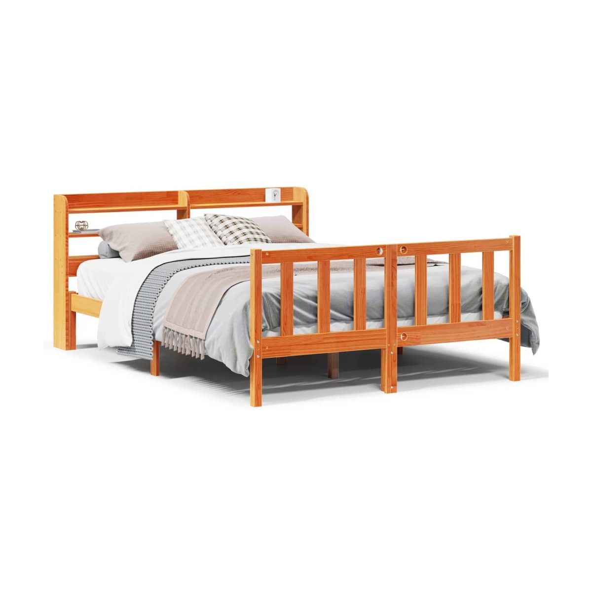 ¡Disfruta de una buena noche de sueño en esta estructura de cama de madera! Es un aporte práctico y decorativo para la casa. Madera de pino maciza: La madera de pino maciza es un bonito material natural. La madera de pino tiene vetas rectas, y los nudos dan al material su distintivo aspecto rústico.Estructura de cama resistente: La estructura de madera garantiza su solidez y estabilidad. Los listones de madera contrachapada proporcionan una buena distribución del peso, lo que garantiza que el colchón se mantenga en su sitio con cada giro y vuelta del cuerpo mientras duermes.Cabecero y estribo de cama útiles: El cabecero y el estribo de la cama de madera mantienen el colchón en su lugar. Además, la cabecera te brinda un excelente soporte para la espalda mientras estás sentado leyendo o mirando la televisión.Amplio espacio de almacenamiento: Este elegante cabecero cuenta con dos prácticos estantes, que ofrecen un amplio espacio de almacenamiento para tener todos tus artículos esenciales para la noche al alcance de la mano. Información útil:El colchón no está incluido con la cama. Disponemos de una variada selección de colchones. Puedes echar un vistazo a nuestra tienda para buscar el colchón correspondiente.