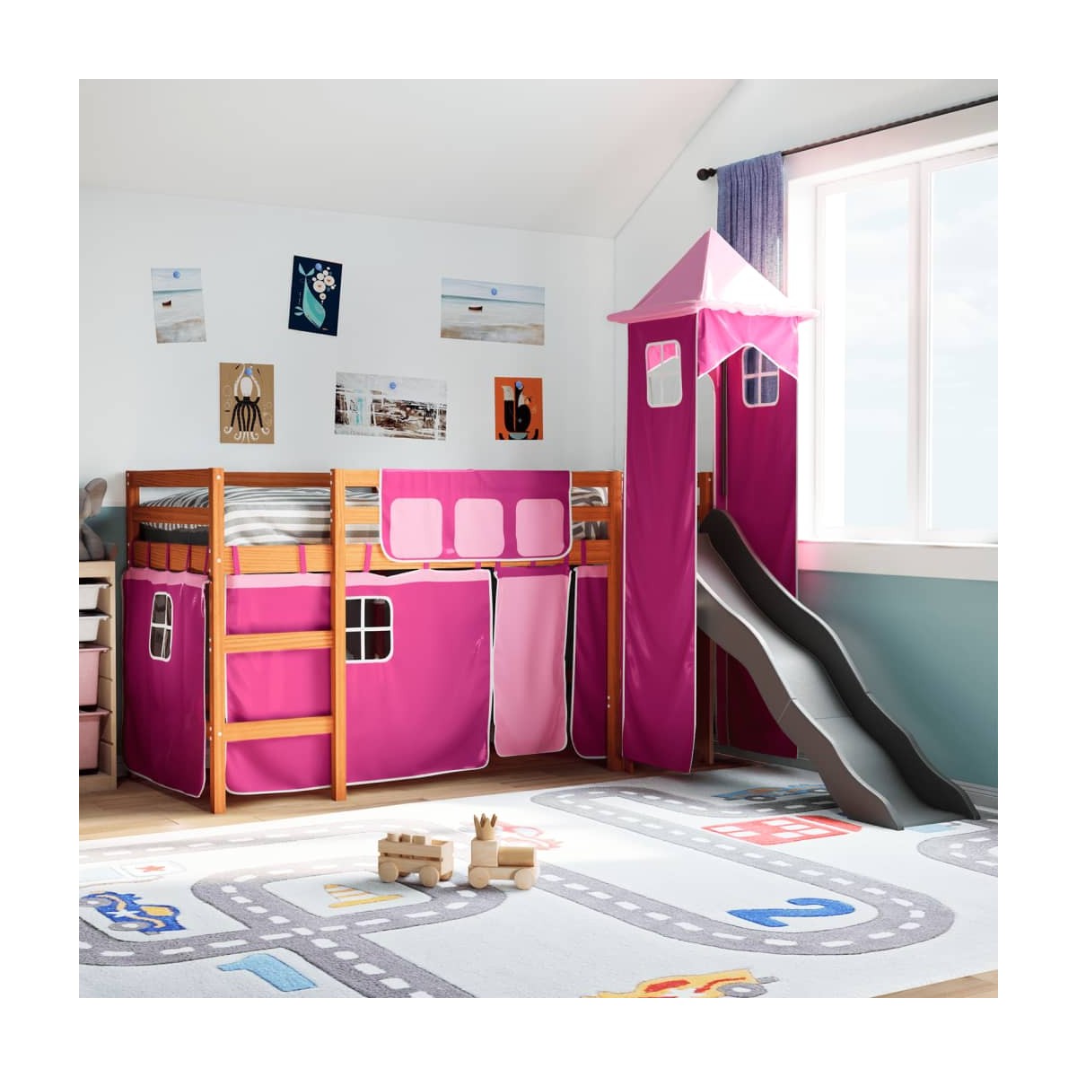 Esta cama alta para niños está hecha de madera maciza de pino y diseñada para entretener además de optimizar el espacio. Estructura estable y duradera: La madera de pino maciza es conocida por su resistencia y durabilidad. Sus vetas rectas y sus característicos nudos contribuyen a su encanto rústico.Mucha diversión: Puedes combinar las cortinas y la torre con la estructura de la cama alta para crear la base secreta para tu hijo. ¡La hora de dormir será un juego y la cama será el centro de atención del dormitorio!Barandillas de seguridad: La cama alta individual viene con barandillas de seguridad en los 4 lados, para que tu hijo pueda dormir sin preocuparte de que se caiga.Práctica escalera y tobogán: Esta cama nido infantil tiene un divertido tobogán que convierte la habitación en un parque dentro de casa. La combinación de una escalera para trepar y un tobogán hace que la hora de dormir resulte más animada y emocionante para los niños. Somier de láminas para un soporte óptimo: La estructura de cama está equipada con un somier de láminas para el apoyo y la transpirabilidad del colchón. Información útil:El colchón no está incluido con la cama. Disponemos de una variada selección de colchones. Puedes echar un vistazo a nuestra tienda para buscar el colchón correspondiente. Advertencia:Para evitar que vuelque, este producto debe usarse con el dispositivo de fijación a la pared suministrado.