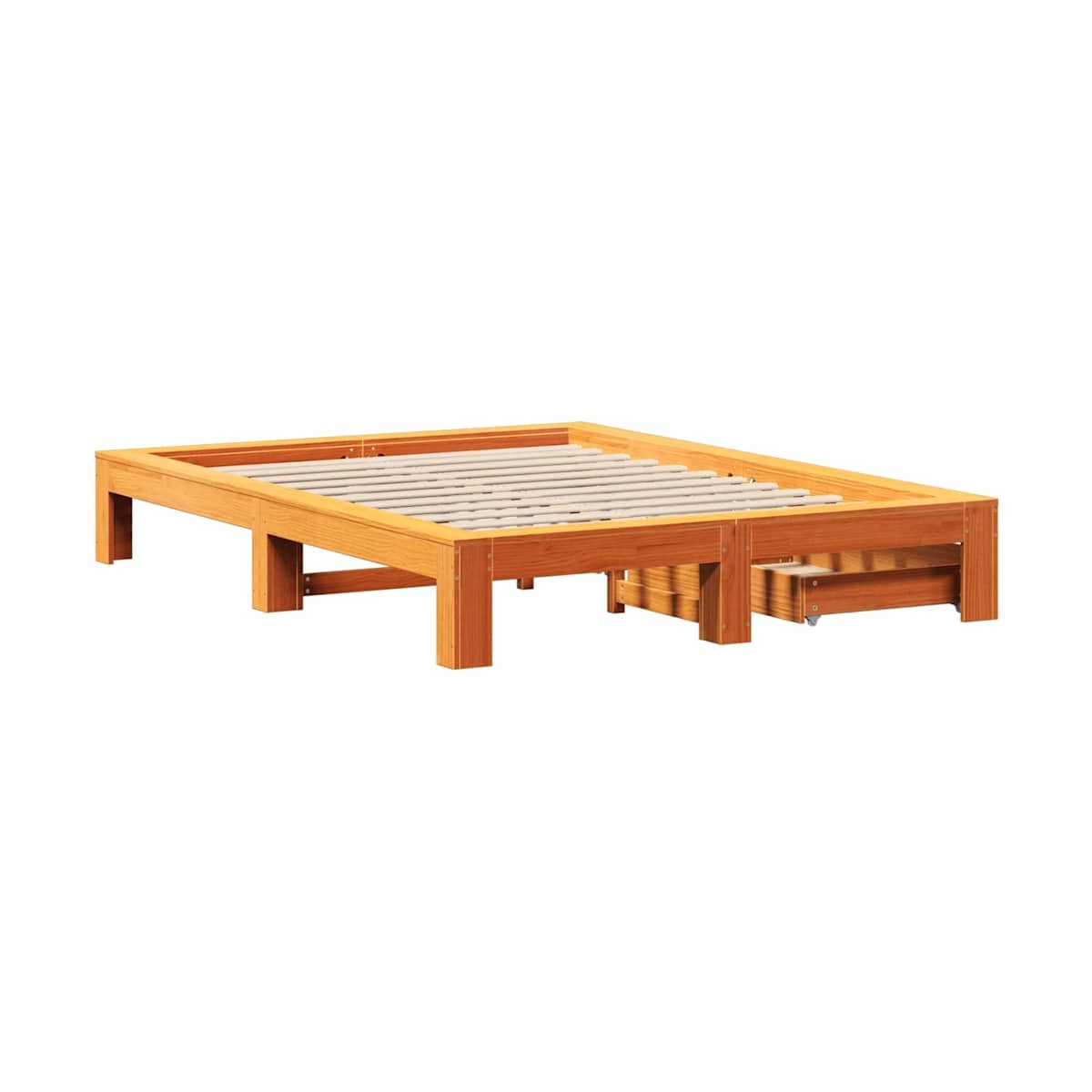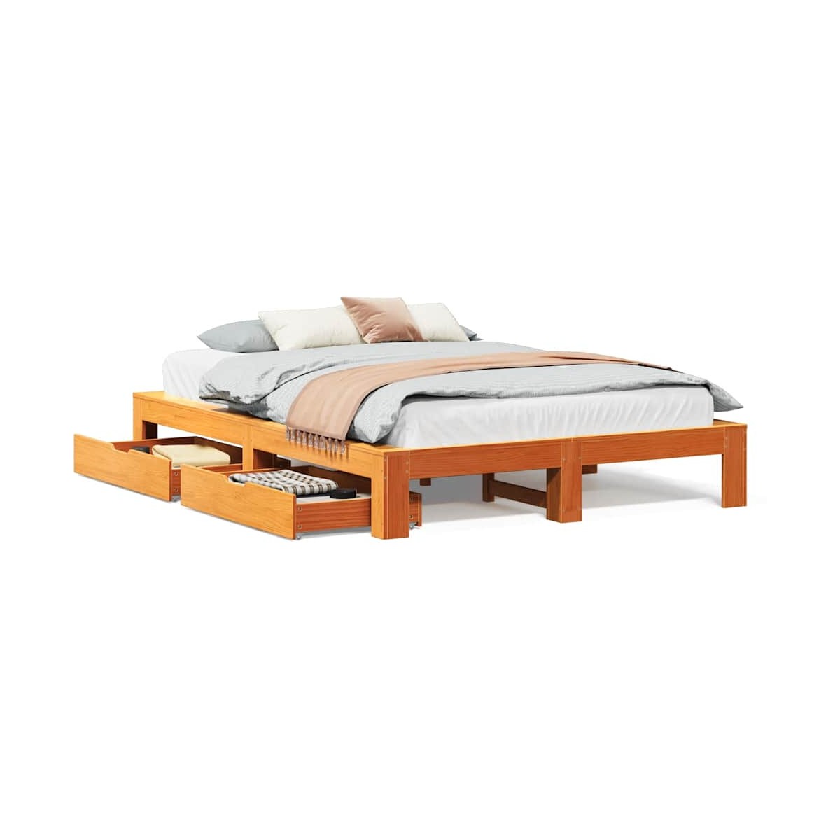 Consigue un sueño más reparador con esta estructura de cama. Es un aporte acogedor para cualquier dormitorio. Estructura estable y duradera: La madera de pino maciza es conocida por su resistencia y durabilidad. Sus vetas rectas y sus característicos nudos contribuyen a su encanto rústico.Somier de láminas para un soporte óptimo: La estructura de cama está equipada con un somier de láminas para el apoyo y la transpirabilidad del colchón.Aproveche al máximo el espacio: Esta base de cama cuenta con dos cajones debajo, que proporcionan almacenamiento para artículos como ropa de cama extra, ropa de temporada y juguetes.Patas estables y duraderas: Esta estructura de cama de madera está sostenida por patas resistentes, lo que garantiza estabilidad, seguridad y firmeza.Maniobrabilidad sin esfuerzo: Este cajón de almacenamiento bajo la cama cuenta con cuatro ruedas, que proporcionan una maniobrabilidad suave y sin esfuerzo para deslizarse dentro y fuera de debajo de tu cama. Información útil:El colchón no está incluido con la cama. Disponemos de una variada selección de colchones. Puedes echar un vistazo a nuestra tienda para buscar el colchón correspondiente.