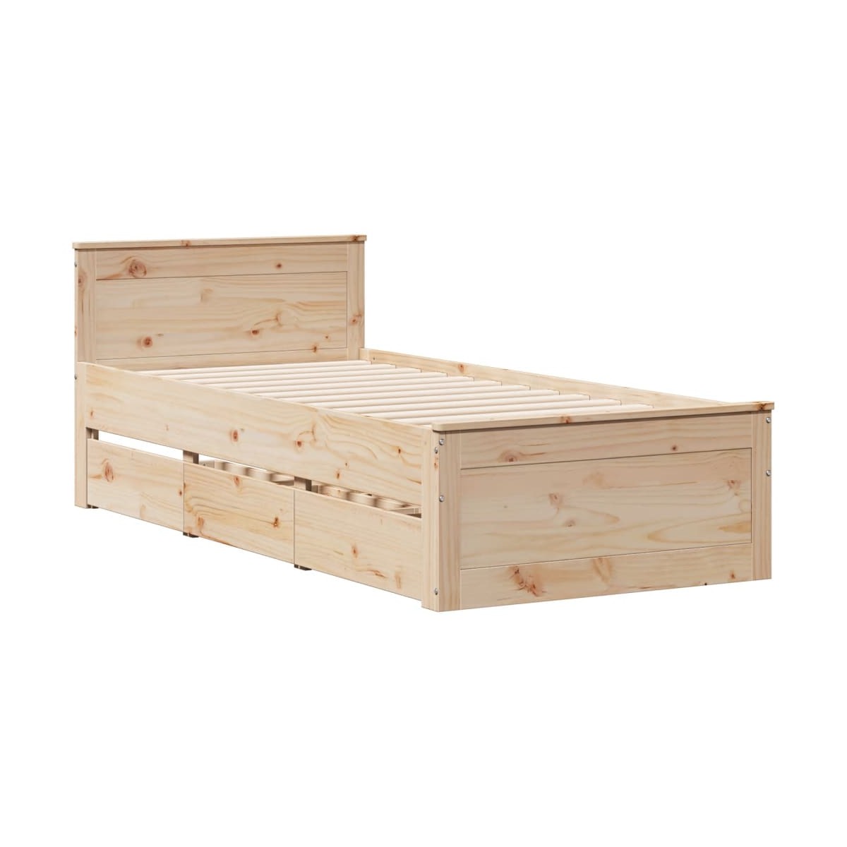 Consigue un sueño más reparador con esta estructura de cama. Es un aporte acogedor para cualquier dormitorio. Estructura estable y duradera: La madera de pino maciza es conocida por su resistencia y durabilidad. Sus vetas rectas y sus característicos nudos contribuyen a su encanto rústico.Somier de láminas para un soporte óptimo: La estructura de cama está equipada con un somier de láminas para el apoyo y la transpirabilidad del colchón.Patas estables y duraderas: Esta cama está sostenida por patas resistentes, lo que garantiza estabilidad, seguridad y firmeza.Cabecero funcional: El cabecero de la cama de madera puede mantener el colchón en su sitio. Además, el cabecero te brinda un excelente soporte para la espalda mientras estás sentado leyendo o mirando la televisión.Función de almacenamiento: Este somier ofrece cajones para mantener tus revistas, libros, juguetes y otros objetos pequeños bien organizados. Información útil:El colchón no está incluido con la cama. Disponemos de una variada selección de colchones. Puedes echar un vistazo a nuestra tienda para buscar el colchón correspondiente.