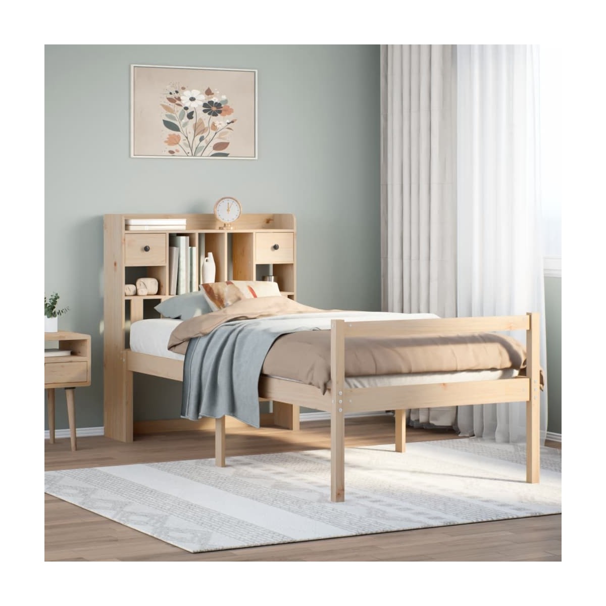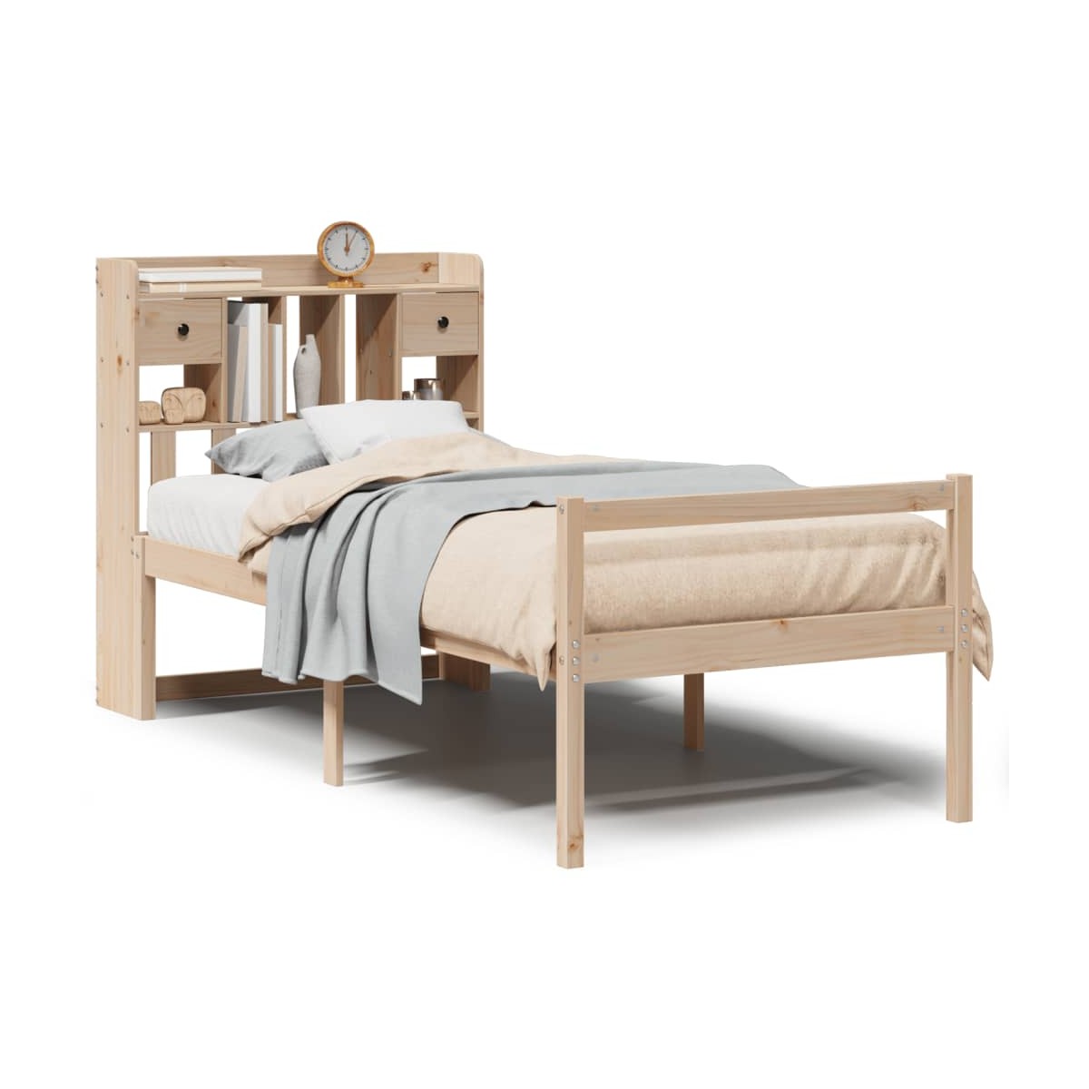 ¡Consigue una mejor noche de sueño reparador con esta cama con estantería! Es un aporte acogedor para cualquier dormitorio. Estructura estable y duradera: La madera de pino maciza es conocida por su resistencia y durabilidad. Sus vetas rectas y sus característicos nudos contribuyen a su encanto rústico.Somier de láminas para un soporte óptimo: La estructura de cama está equipada con un somier de láminas para el apoyo y la transpirabilidad del colchón.Amplio espacio de almacenamiento: El cabecero de estantería ofrece un amplio espacio de almacenamiento para mantener libros, artículos decorativos o pertenencias personales al alcance de la mano, lo que reduce el desorden en el dormitorio.Práctico pie de cama: El pie de cama no solo contribuye a la estabilidad general del marco de la cama, proporcionando un entorno seguro para dormir, sino que también asegura su colchón en su lugar y evita que las mantas, sábanas y otra ropa de cama se caigan del extremo de la cama, manteniendo una apariencia ordenada.Ahorro de espacio: Este cabecero es una opción de ahorro de espacio que puede sustituir la necesidad de una mesilla de noche, ayudando a maximizar el espacio de tu dormitorio, y haciéndolo ideal para espacios pequeños o limitados. Información útil:El colchón no está incluido con la cama. Disponemos de una variada selección de colchones. Puedes echar un vistazo a nuestra tienda para buscar el colchón correspondiente.
