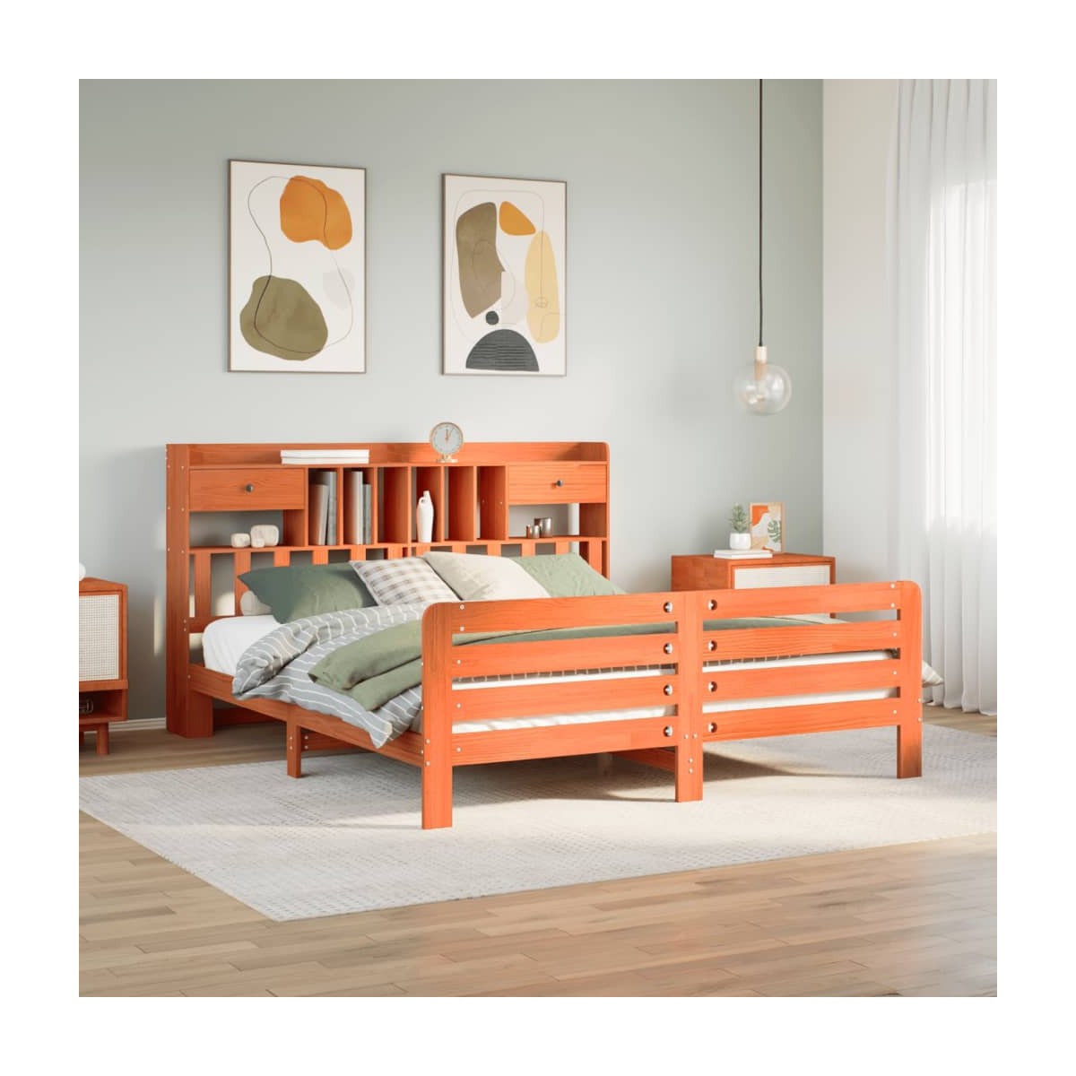¡Consigue una mejor noche de sueño reparador con esta cama con estantería! Es un aporte acogedor para cualquier dormitorio. Estructura estable y duradera: La madera de pino maciza es conocida por su resistencia y durabilidad. Sus vetas rectas y sus característicos nudos contribuyen a su encanto rústico. Somier de láminas para un soporte óptimo: La estructura de cama está equipada con un somier de láminas para el apoyo y la transpirabilidad del colchón. Amplio espacio de almacenamiento: El cabecero de estantería ofrece un amplio espacio de almacenamiento para mantener libros, artículos decorativos o pertenencias personales al alcance de la mano, lo que reduce el desorden en el dormitorio. Práctico pie de cama: El pie de cama no solo contribuye a la estabilidad general del marco de la cama, proporcionando un entorno seguro para dormir, sino que también asegura su colchón en su lugar y evita que las mantas, sábanas y otra ropa de cama se caigan del extremo de la cama, manteniendo una apariencia ordenada. Ahorro de espacio: Este cabecero es una opción de ahorro de espacio que puede sustituir la necesidad de una mesilla de noche, ayudando a maximizar el espacio de tu dormitorio, y haciéndolo ideal para espacios pequeños o limitados. Información útil:El colchón no está incluido con la cama. Disponemos de una variada selección de colchones. Puedes echar un vistazo a nuestra tienda para buscar el colchón correspondiente.