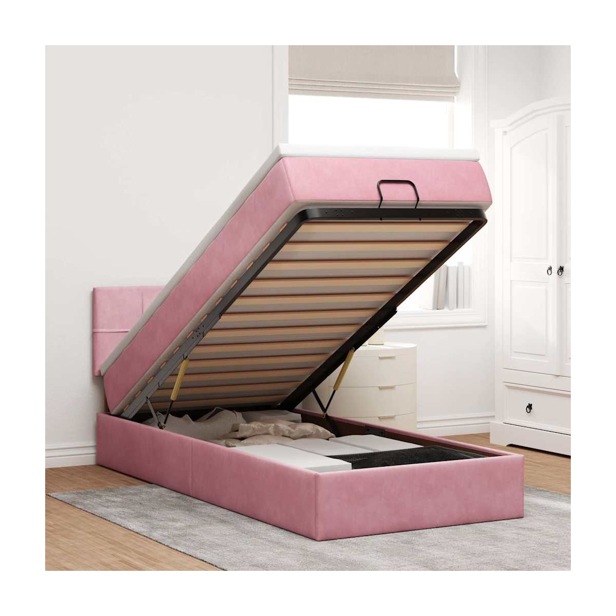 ¡Utilice esta estructura de cama otomana con colchón para disfrutar de una noche de sueño reparador! Le ofrece una solución de almacenamiento y una experiencia de sueño cómoda. Material suave y cómodo: La tela de terciopelo ofrece una superficie suave y lisa que proporciona una agradable sensación contra el tacto, aportándole calidez y el máximo confort.Colchón de muelles ensacados: Este colchón de muelles ensacados cuenta con muelles ensacados individuales que funcionan de forma independiente para proporcionar un apoyo personalizado reaccionando únicamente a la presión de cada zona. Este diseño evita que se enrolle y reduce la transferencia de movimiento en comparación con los colchones tradicionales de bobina abierta. Cada muelle ensacado sostiene el cuerpo individualmente.amplio espacio de almacenamiento debajo de la cama: gracias al mecanismo de elevación hidráulico, el marco de la cama ofrece un amplio espacio de almacenamiento debajo de la cama, maximizando el espacio sin ocupar área adicional en el piso.Cubrecolchón cómodo: Este cubrecolchón mejora el soporte y la comodidad con su superficie suave y transpirable al tiempo que prolonga la vida útil de su colchón. Su funda extraíble permite un fácil lavado, lo que facilita el mantenimiento. Información útil:Por razones de higiene, el colchón no puede devolverse si se ha quitado o abierto el embalaje.
