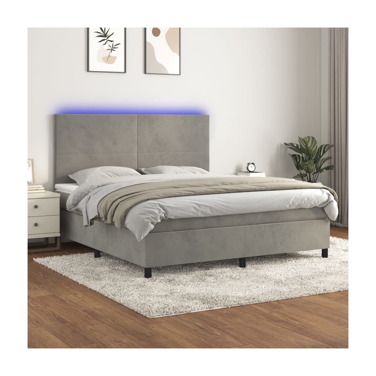 Utiliza esta cama box spring con colchón y LED para disfrutar de un sueño reparador. Es el centro de atención de tu dormitorio. Terciopelo suave: El terciopelo es una tela suave y lujosa, reconocida por su denso pelo de fibras cortadas de forma uniforme que tienen una suave pelusa. La tela de terciopelo posee un característico y suave tacto, lo que hace que sea cómoda al tacto.Cabecero práctico: El cabecero de la cama es ajustable en altura según tus preferencias. El cabecero de la cama te proporciona un excelente apoyo para la espalda mientras estás sentado en la cama para leer o ver la televisión.Tira de LED de colores: Alegra la oscuridad con luces LED de colores.Colchón de muelles ensacados: El muelle ensacado individual incorporado es conocido por su altísima calidad, al tiempo que garantiza un alto nivel de durabilidad y adaptabilidad. Puede absorber eficazmente el ruido y los golpes causados por los lanzamientos y los giros.Protector de colchón respetuoso con la piel: El protector de colchón tiene una funda de tejido resistente y respetuoso con la piel, que lo hace suave y confortable. Nota:Por razones de higiene, el colchón no puede devolverse si se ha quitado o abierto el embalaje.Únicamente puedes cortar por la parte con el símbolo de las tijeras y únicamente la parte con el USB seguirá funcionando como antes.Cada producto viene con un manual de montaje en la caja para facilitar el montaje.El producto tiene un conector USB, pero no se incluye la fuente de alimentación USB de 5 V certificada.
