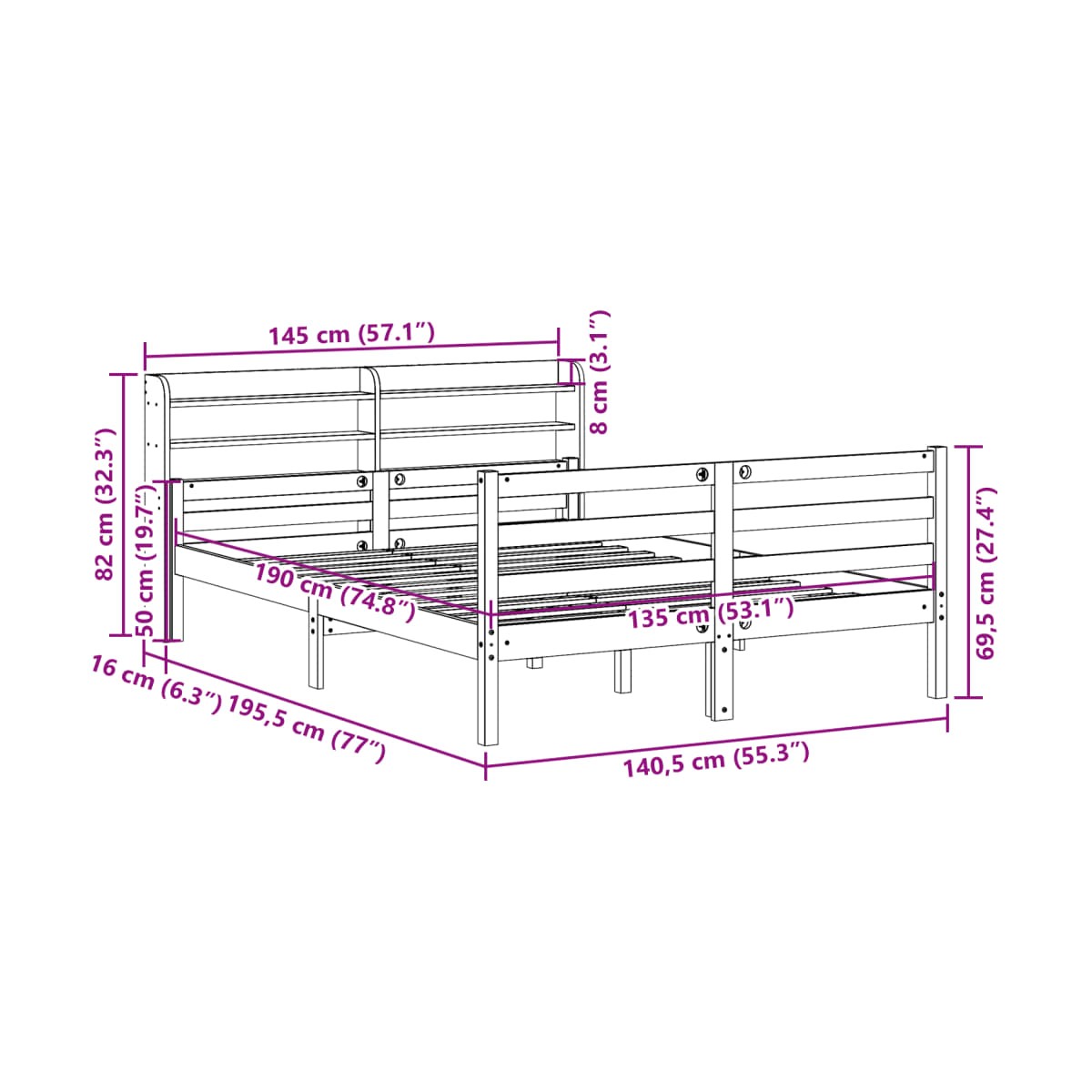 - Dimensiones del cabecero: 145 x 16 x 82 cm (largo x ancho x alto)