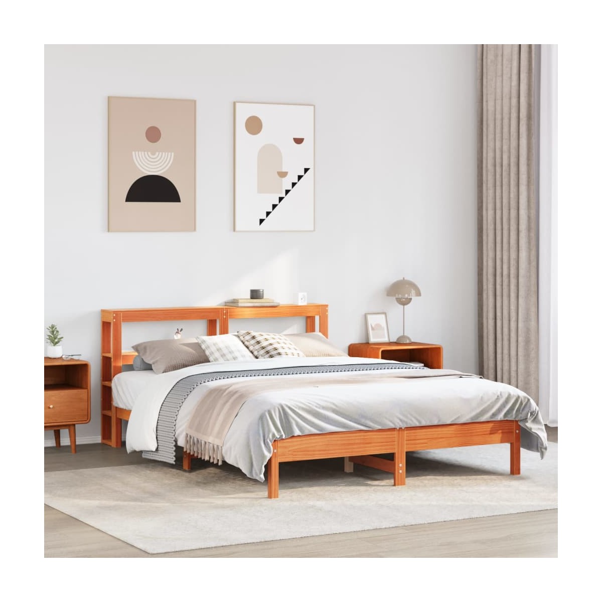 Consigue un sueño más reparador con esta estructura de cama. Es un aporte acogedor para cualquier dormitorio. Estructura estable y duradera: La madera de pino maciza es conocida por su resistencia y durabilidad. Sus vetas rectas y sus característicos nudos contribuyen a su encanto rústico.Somier de láminas para un soporte óptimo: La estructura de cama está equipada con un somier de láminas para el apoyo y la transpirabilidad del colchón.Cabecero versátil: Esta estructura de cama viene con un cabecero que proporciona un excelente soporte para la espalda cuando te sientas en la cama para leer o ver la televisión, a la vez que sirve como elemento decorativo.Amplio espacio de almacenamiento: Este elegante cabecero cuenta con dos prácticos estantes, que ofrecen un amplio espacio de almacenamiento para tener todos tus artículos esenciales para la noche al alcance de la mano. Información útil:El colchón no está incluido con la cama. Disponemos de una variada selección de colchones. Puedes echar un vistazo a nuestra tienda para buscar el colchón correspondiente.