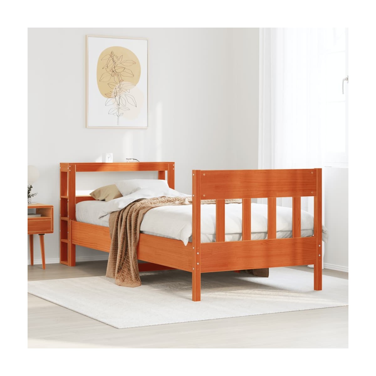 Consigue un sueño más reparador con esta estructura de cama. Es un aporte acogedor para cualquier dormitorio. Estructura estable y duradera: La madera de pino maciza es conocida por su resistencia y durabilidad. Sus vetas rectas y sus característicos nudos contribuyen a su encanto rústico.Somier de láminas para un soporte óptimo: La estructura de cama está equipada con un somier de láminas para el apoyo y la transpirabilidad del colchón.Cabecero versátil: Esta estructura de cama viene con un cabecero que proporciona un excelente soporte para la espalda cuando te sientas en la cama para leer o ver la televisión, a la vez que sirve como elemento decorativo.Amplio espacio de almacenamiento: Este elegante cabecero cuenta con dos prácticos estantes, que ofrecen un amplio espacio de almacenamiento para tener todos tus artículos esenciales para la noche al alcance de la mano. Información útil:El colchón no está incluido con la cama. Disponemos de una variada selección de colchones. Puedes echar un vistazo a nuestra tienda para buscar el colchón correspondiente.