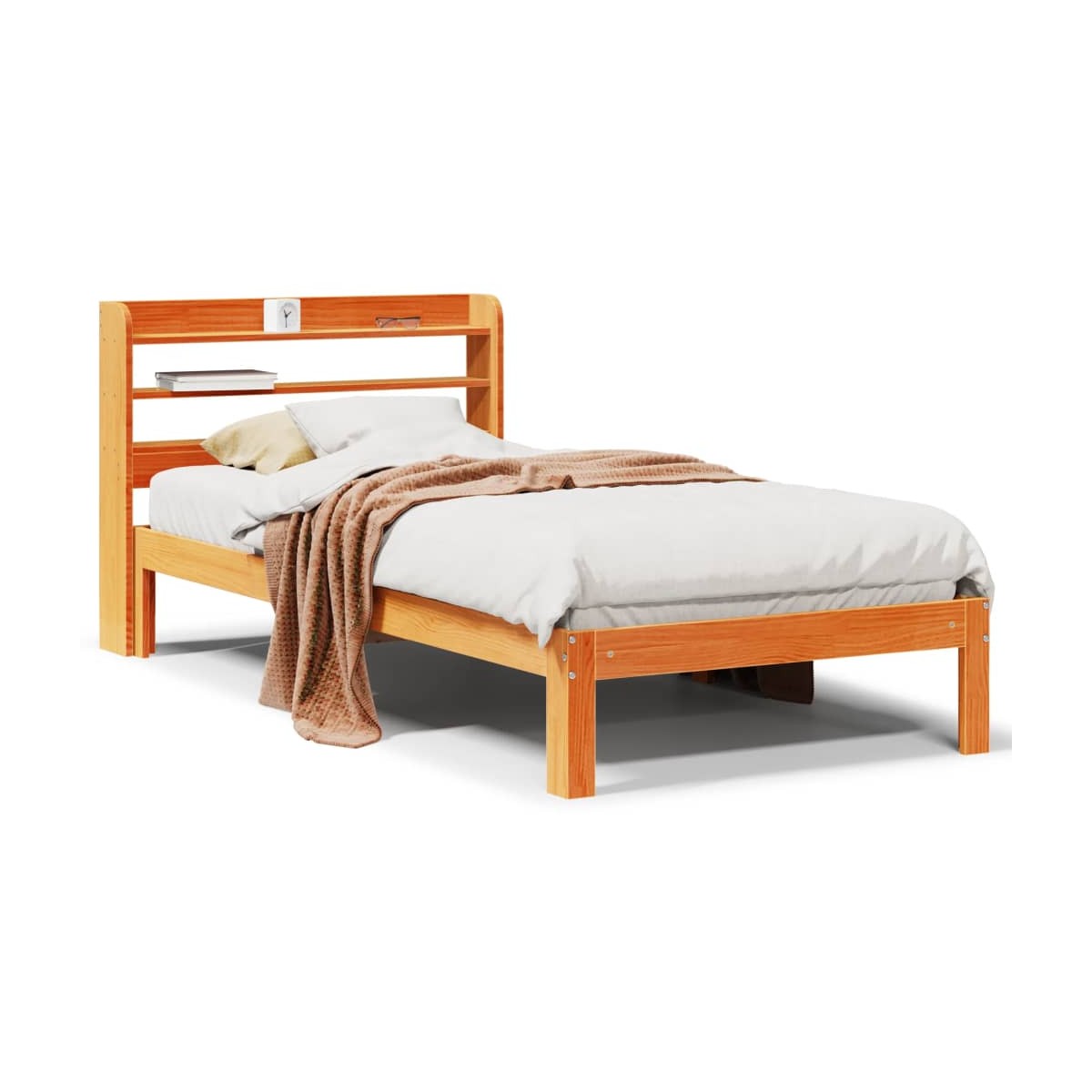 Consigue un sueño más reparador con esta estructura de cama. Es un aporte acogedor para cualquier dormitorio. Estructura estable y duradera: La madera de pino maciza es conocida por su resistencia y durabilidad. Sus vetas rectas y sus característicos nudos contribuyen a su encanto rústico.Somier de láminas para un soporte óptimo: La estructura de cama está equipada con un somier de láminas para el apoyo y la transpirabilidad del colchón.Amplio espacio de almacenamiento: Este elegante cabecero cuenta con tres prácticos estantes, que ofrecen un amplio espacio de almacenamiento para mantener todos tus objetos esenciales nocturnos al alcance de la mano.Cabecero independiente: El cabecero independiente ofrece una solución sin complicaciones para colocarlo y reposicionarlo sin esfuerzo y sin necesidad de instalarlo en la pared. Información útil:El colchón no está incluido con la cama. Disponemos de una variada selección de colchones. Puedes echar un vistazo a nuestra tienda para buscar el colchón correspondiente.