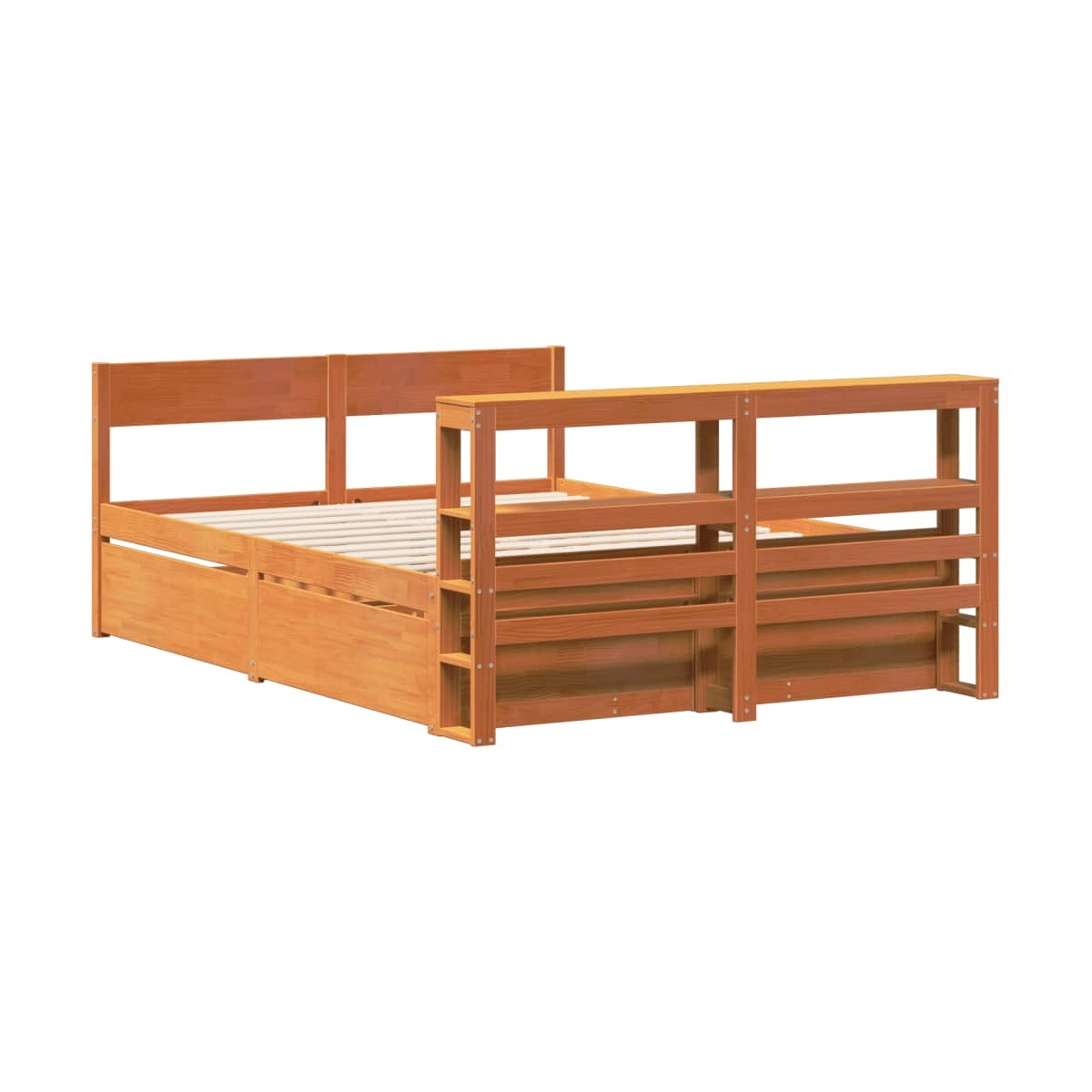 Consigue un sueño más reparador con esta estructura de cama. Es un aporte acogedor para cualquier dormitorio. Estructura estable y duradera: La madera de pino maciza es conocida por su resistencia y durabilidad. Sus vetas rectas y sus característicos nudos contribuyen a su encanto rústico.Somier de láminas para un soporte óptimo: La estructura de cama está equipada con un somier de láminas para el apoyo y la transpirabilidad del colchón.Aprovecha al máximo el espacio: Esta estructura de cama cuenta con cuatro cajones debajo, lo que proporciona almacenamiento para artículos como ropa de cama adicional, ropa de temporada y juguetes.Amplio espacio de almacenamiento: Este elegante cabecero de la cama cuenta con dos prácticos estantes, que ofrecen un amplio espacio de almacenamiento para tener todos tus artículos esenciales para la noche al alcance de la mano.Cabecero independiente: El cabecero independiente ofrece una solución sin complicaciones para colocarlo y reposicionarlo sin esfuerzo y sin necesidad de instalarlo en la pared. Información útil:El colchón no está incluido con la cama. Disponemos de una variada selección de colchones. Puedes echar un vistazo a nuestra tienda para buscar el colchón correspondiente.