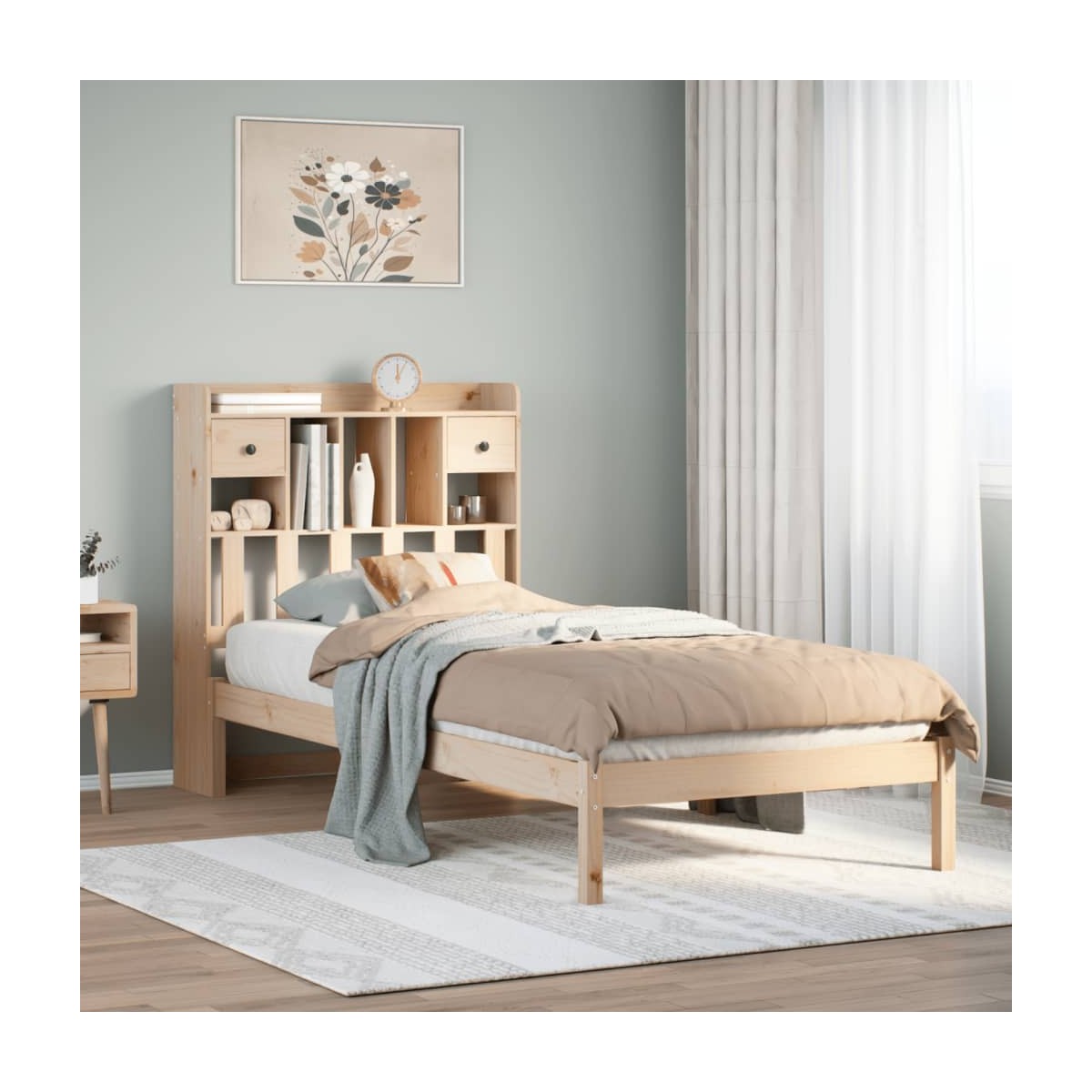 ¡Consigue una mejor noche de sueño reparador con esta cama con estantería! Es un aporte acogedor para cualquier dormitorio. Estructura estable y duradera: La madera de pino maciza es conocida por su resistencia y durabilidad. Sus vetas rectas y sus característicos nudos contribuyen a su encanto rústico.Somier de láminas para un soporte óptimo: La estructura de cama está equipada con un somier de láminas para el apoyo y la transpirabilidad del colchón.Amplio espacio de almacenamiento: El cabecero de estantería ofrece un amplio espacio de almacenamiento para mantener libros, artículos decorativos o pertenencias personales al alcance de la mano, lo que reduce el desorden en el dormitorio.Ahorro de espacio: Este cabecero es una opción de ahorro de espacio que puede sustituir la necesidad de una mesilla de noche, ayudando a maximizar el espacio de tu dormitorio, y haciéndolo ideal para espacios pequeños o limitados. Información útil:El colchón no está incluido con la cama. Disponemos de una variada selección de colchones. Puedes echar un vistazo a nuestra tienda para buscar el colchón correspondiente.